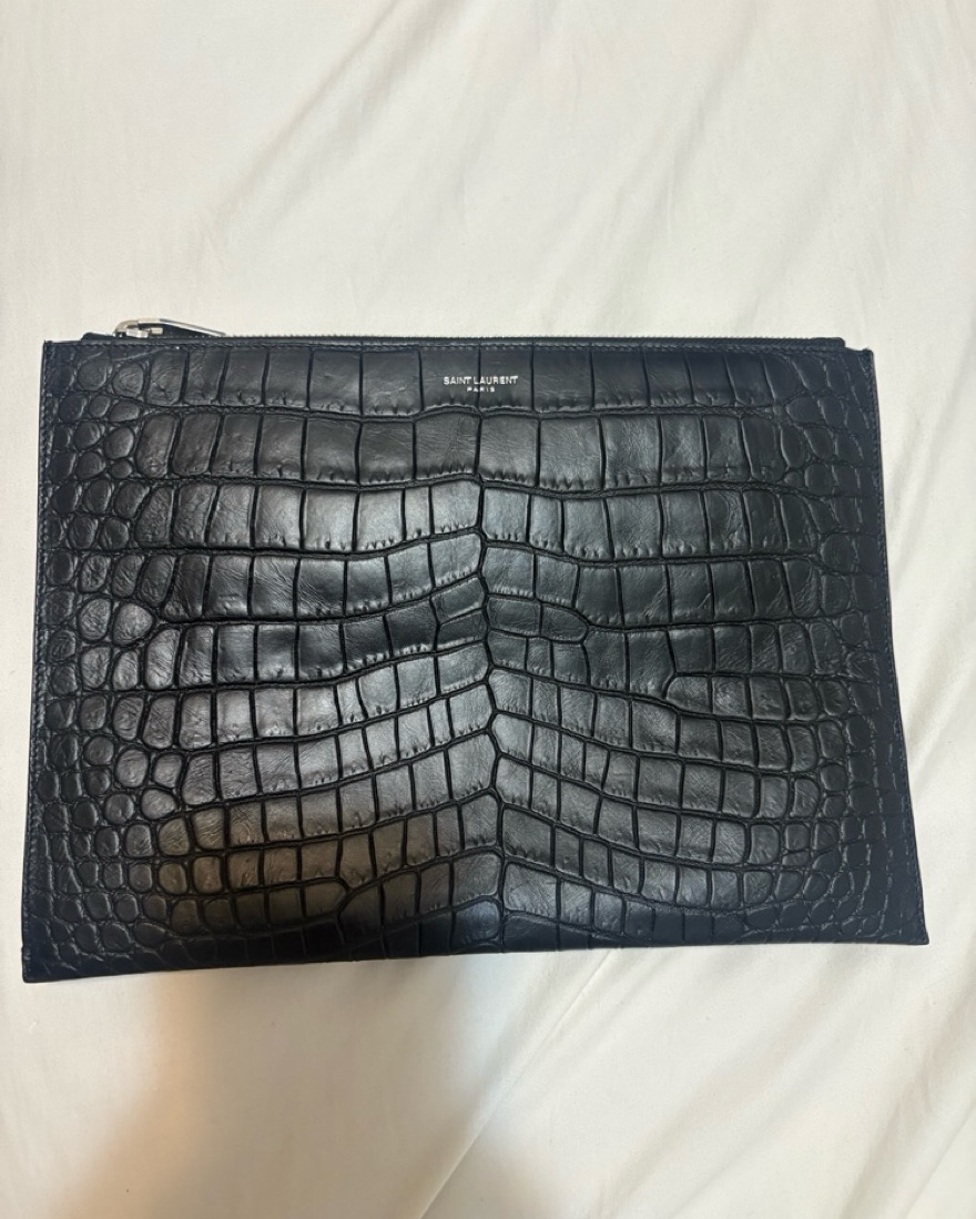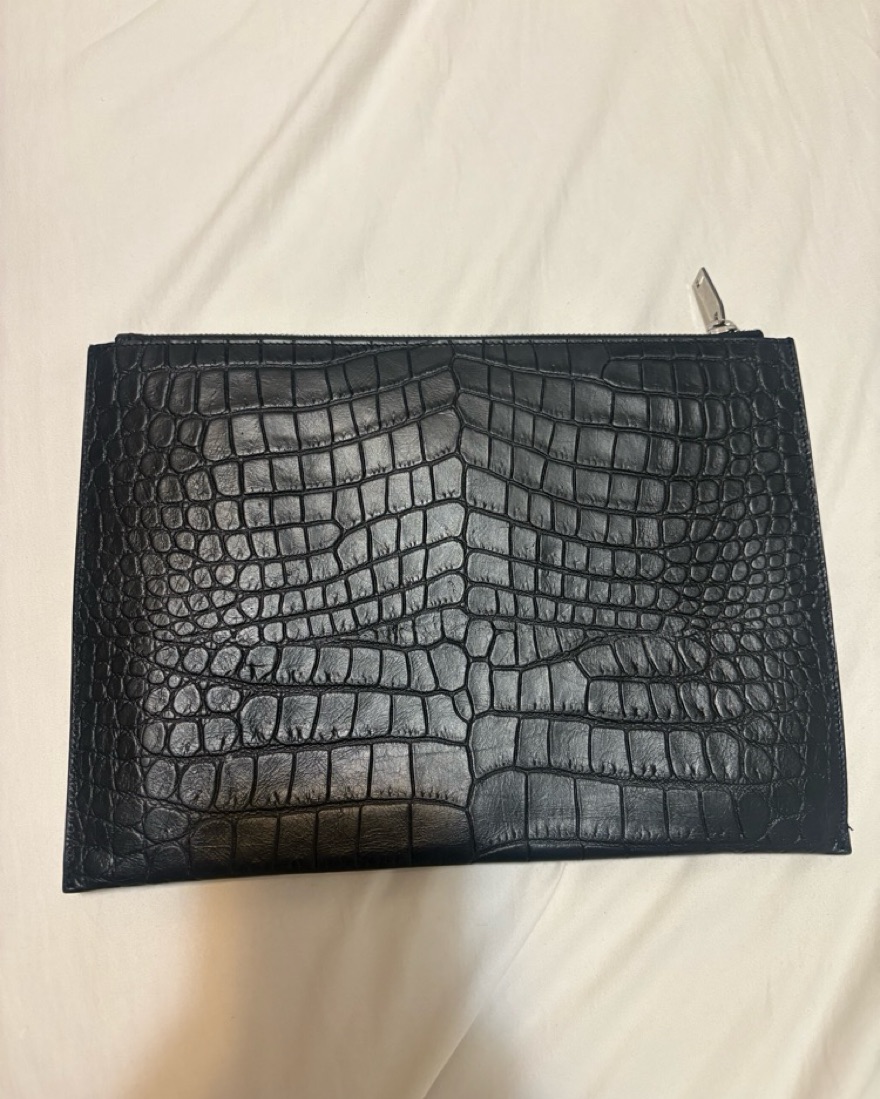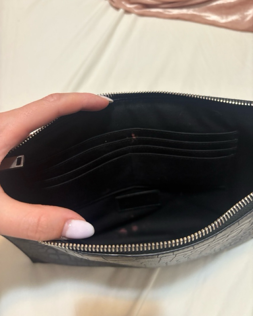 This exquisite croc-embossed leather clutch exudes sophistication and style. It's the perfect accessory to elevate any outfit. Wear it to a business dinner or a wedding. There are slots for your card and plenty of room for a phone.