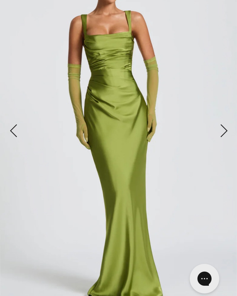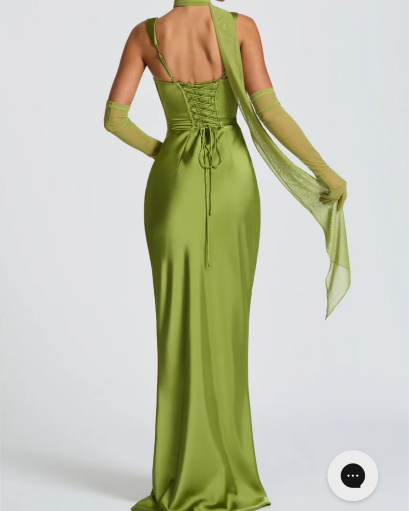 This striking green satin gown is perfect for a glamorous evening event. The fitted silhouette and lace-up back create a flattering, feminine look. Size small brand new