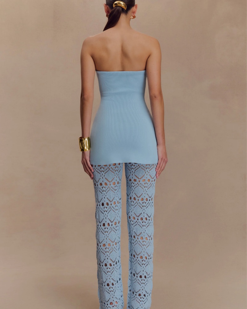 Blue meshki knit set, Anette Bandage Knit strapless top, Trena Crochet Pants, sky blue, size small