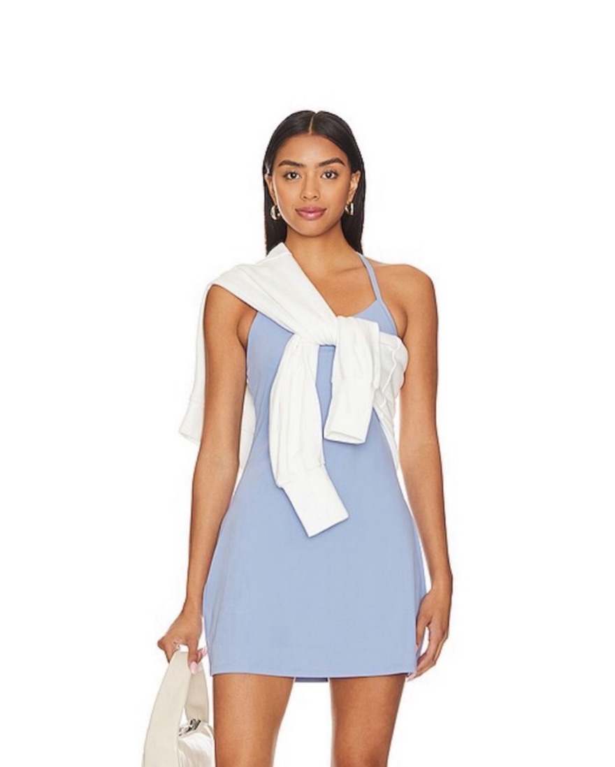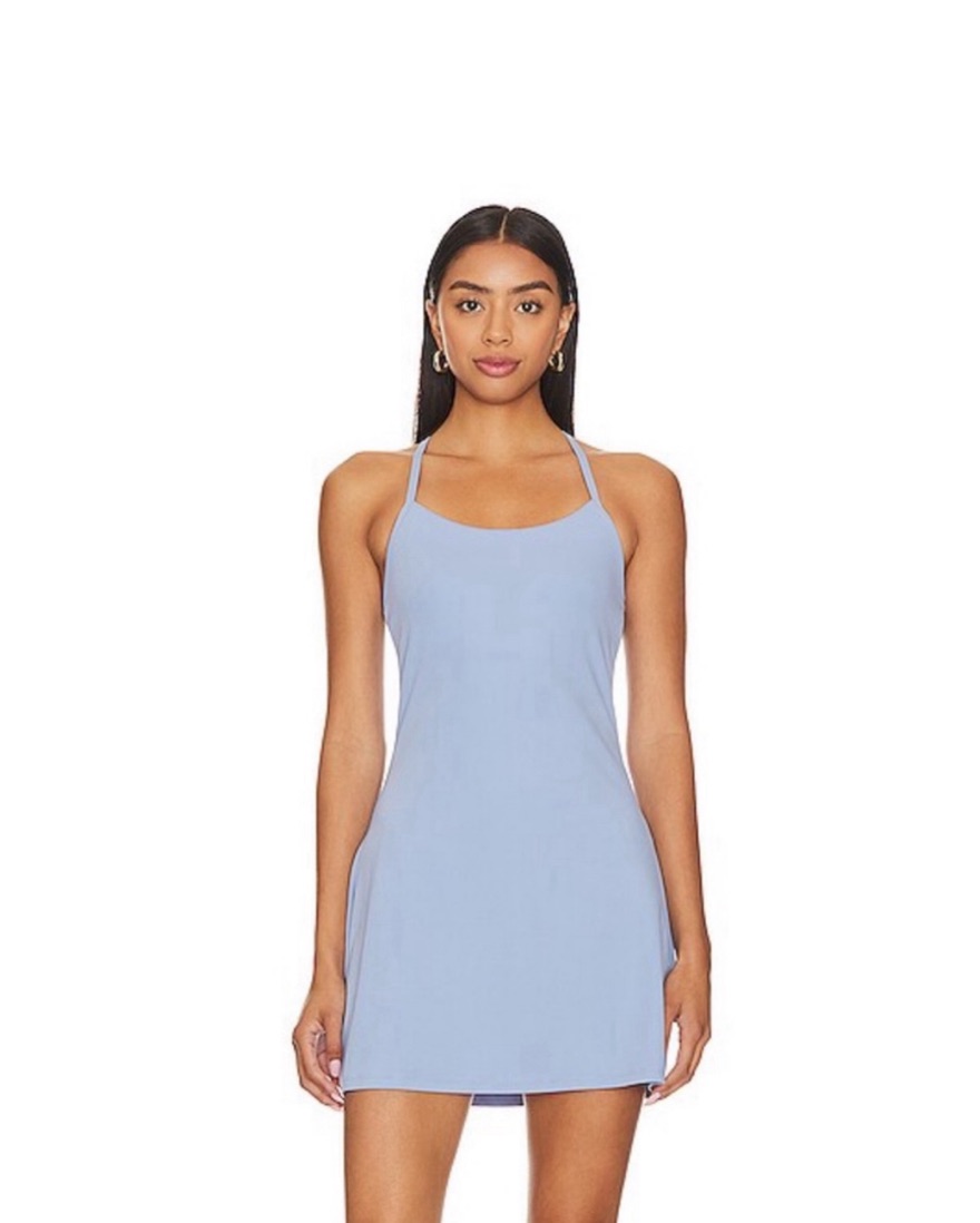 Brand new with tags, athletic dress, built-in mid length shorts and bra, pull-on styling with crosscross adjustable straps, machine washable, color is “Lavender Luster” but is more of a periwinkle.