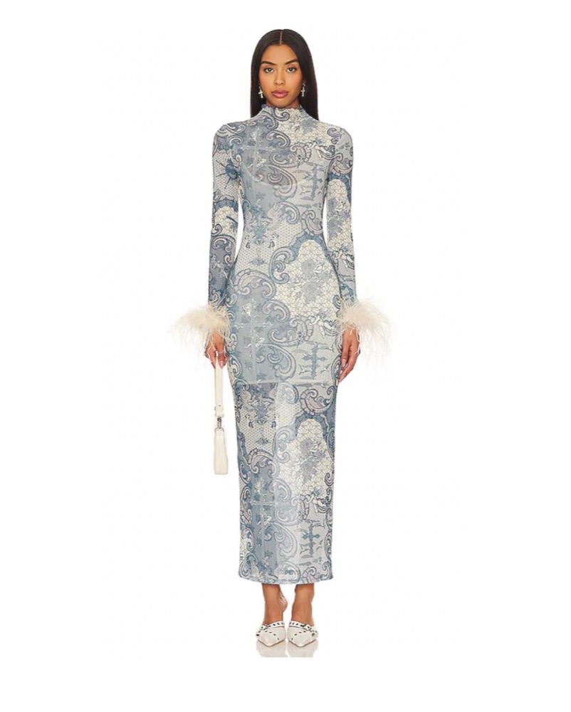 Perfect, new condition only worn once. Mesh, long sleeve maxi dress in a coastal blue pattern with feather cuff sleeves. Comes with dress liner (not attached). It’s so so flattering and unique, but pls be careful with it as it’s one of my favorite dresses! Name: Loba Lara Maxi Dress