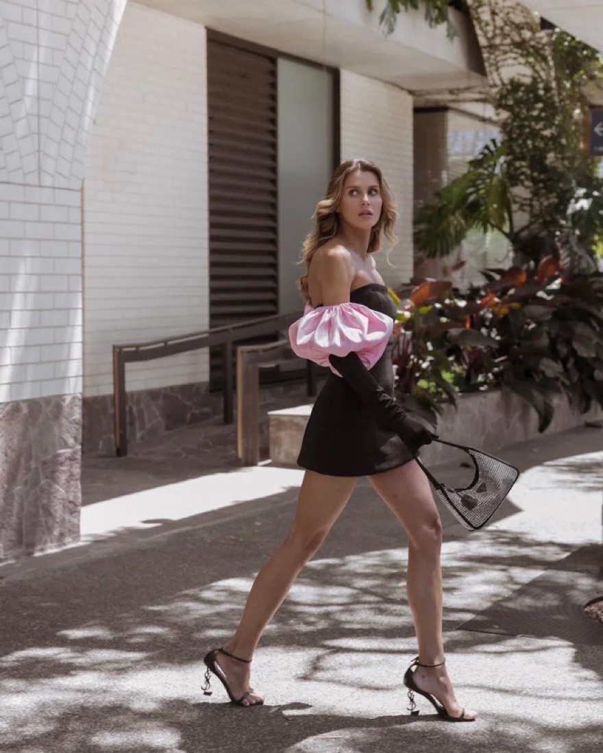 Chic and Fabulous. Size 4! Black dress and gloved and pink puffs. Puffs are seperate from dress and gloves and do not have to be worn.