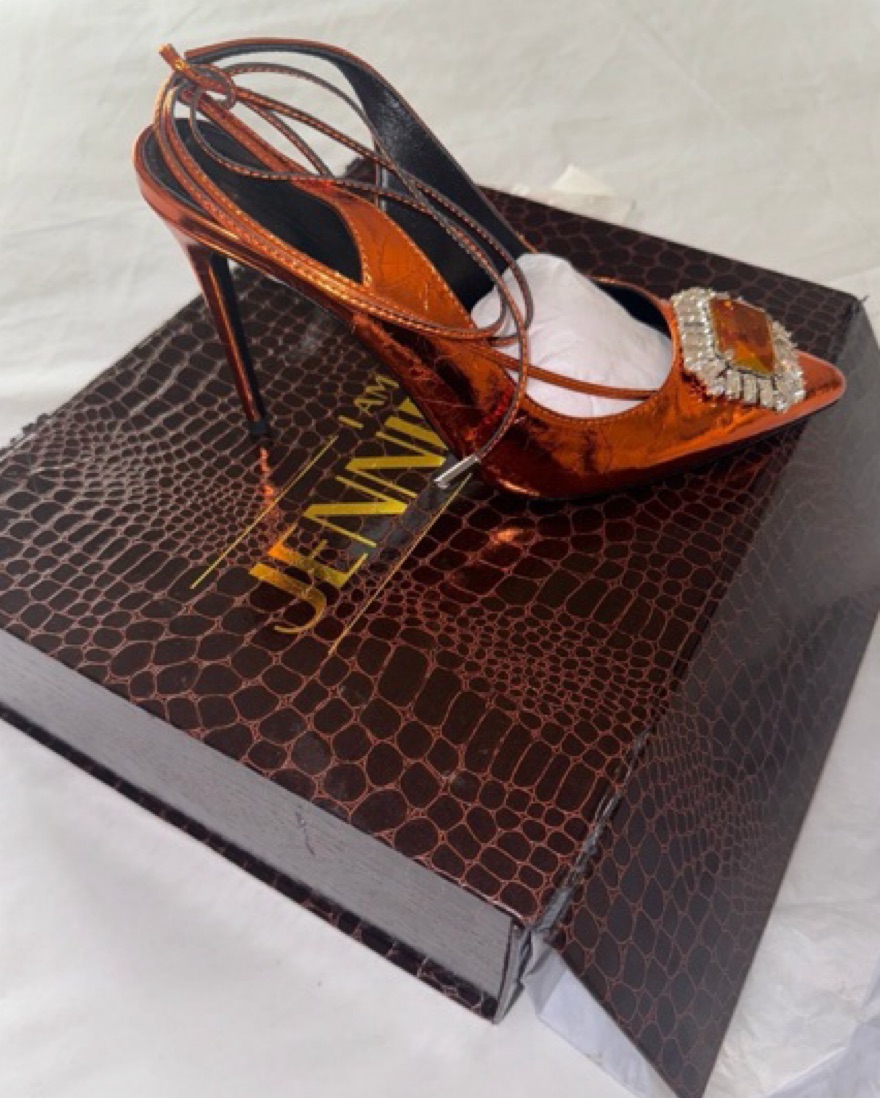 IAMJENNIFERLE cairo pump (amber) size 38 (7.5-8 jo) || 10mm Amber Crackled Metallic Leather Pump with Crystal Brooch