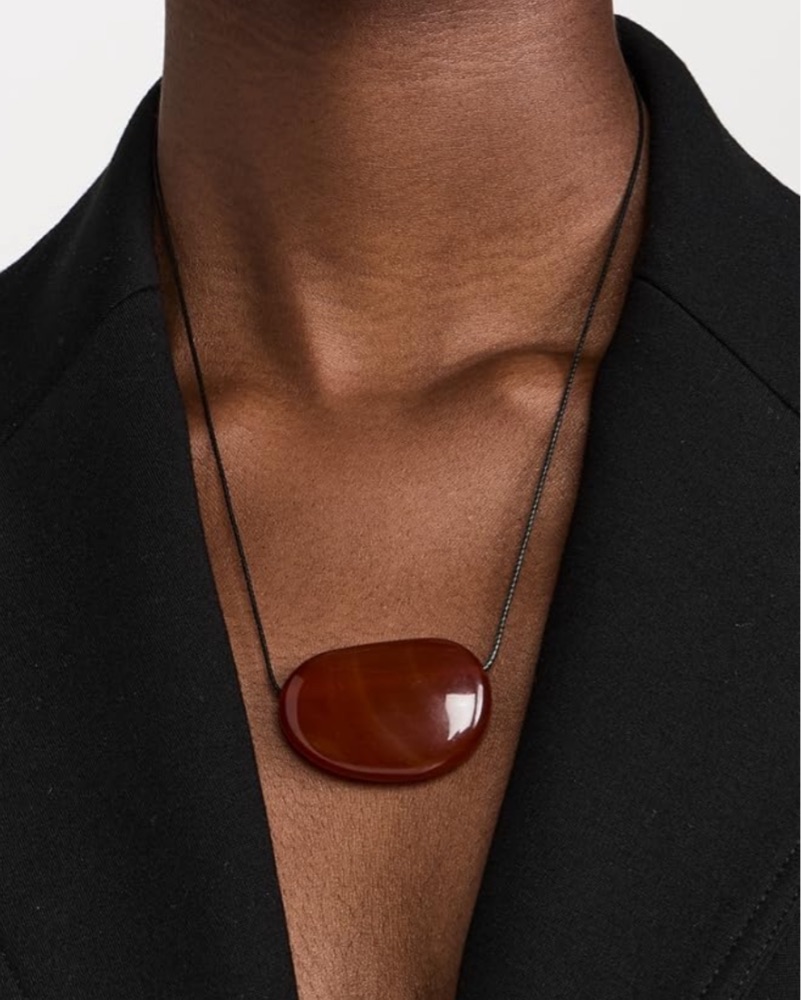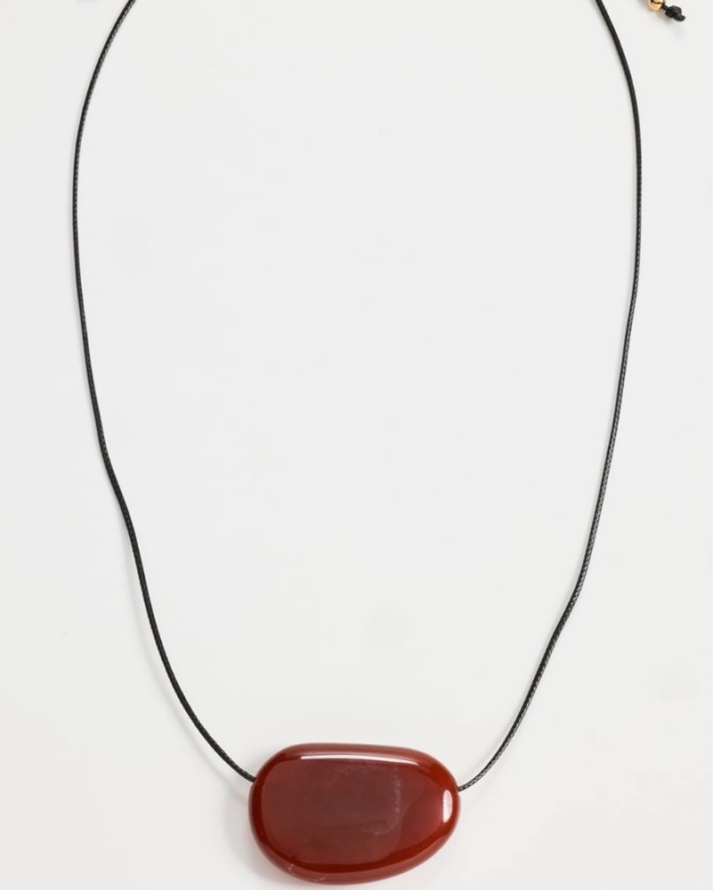 Red stone necklace with black fabric chain and gold detailing. Adjustable strap