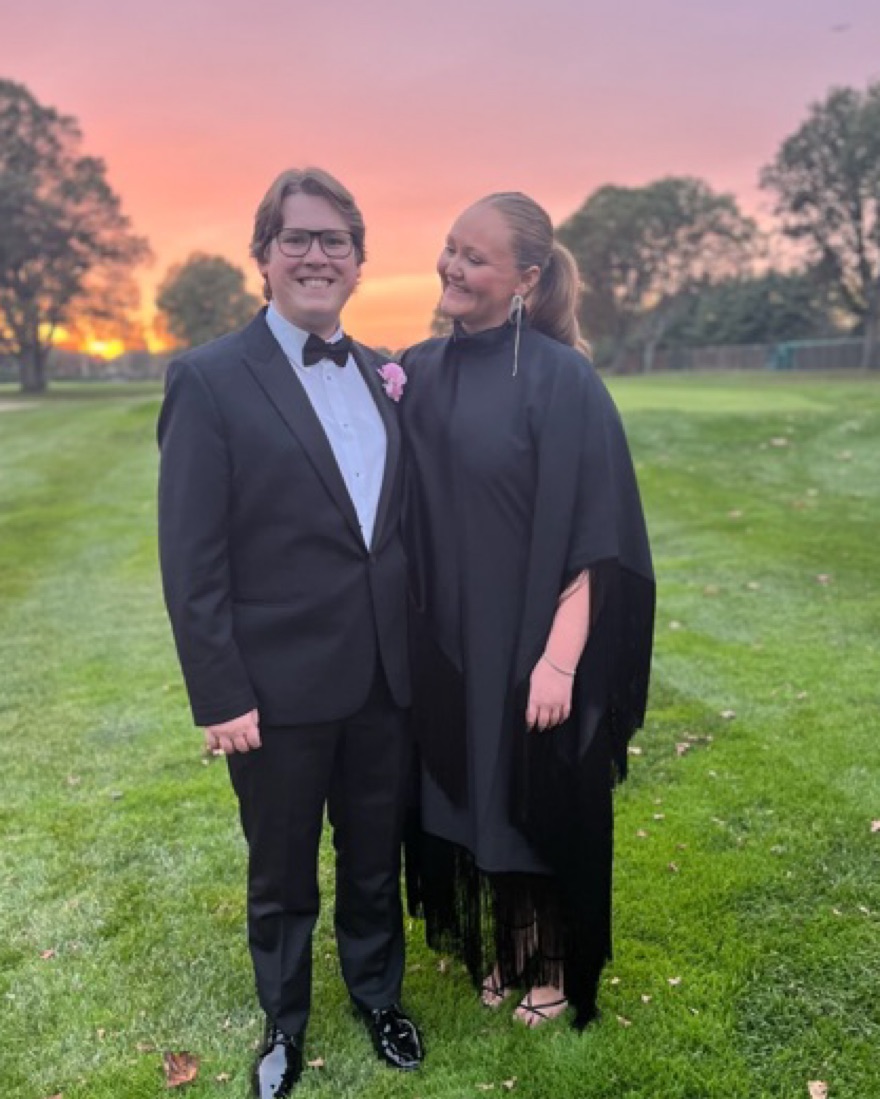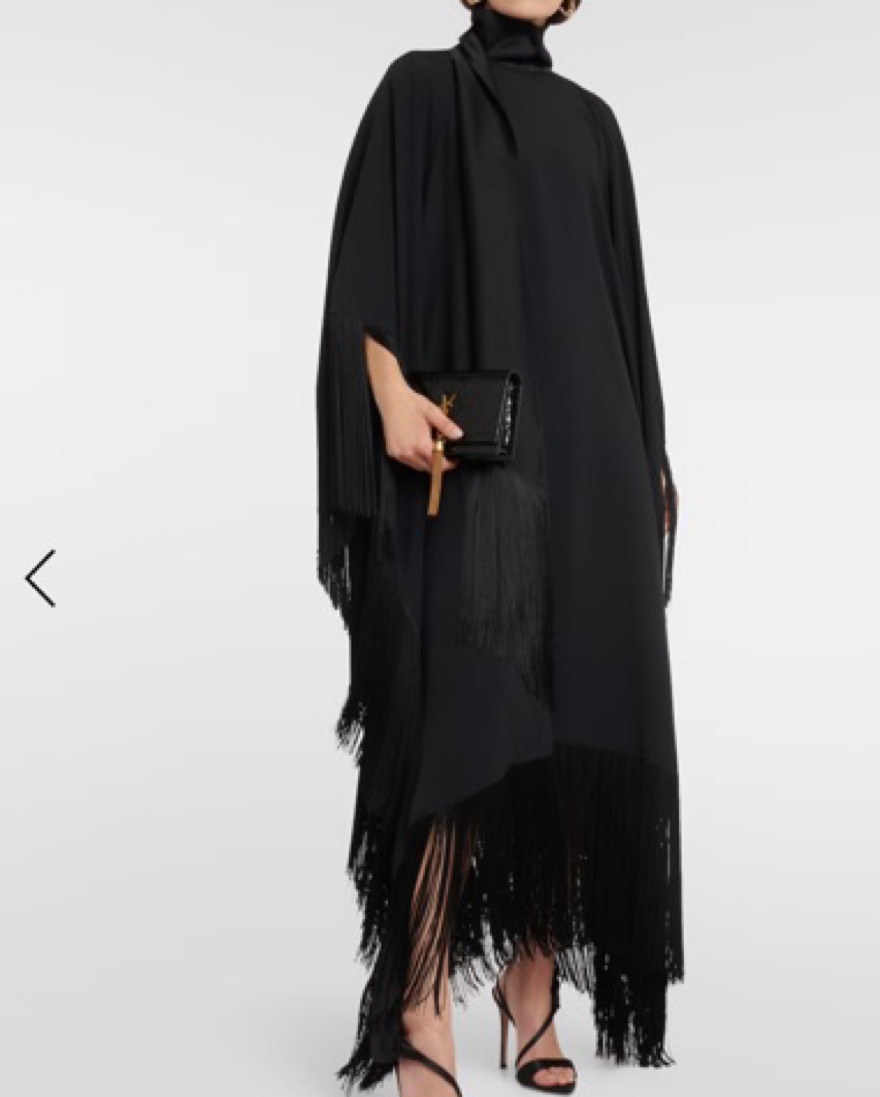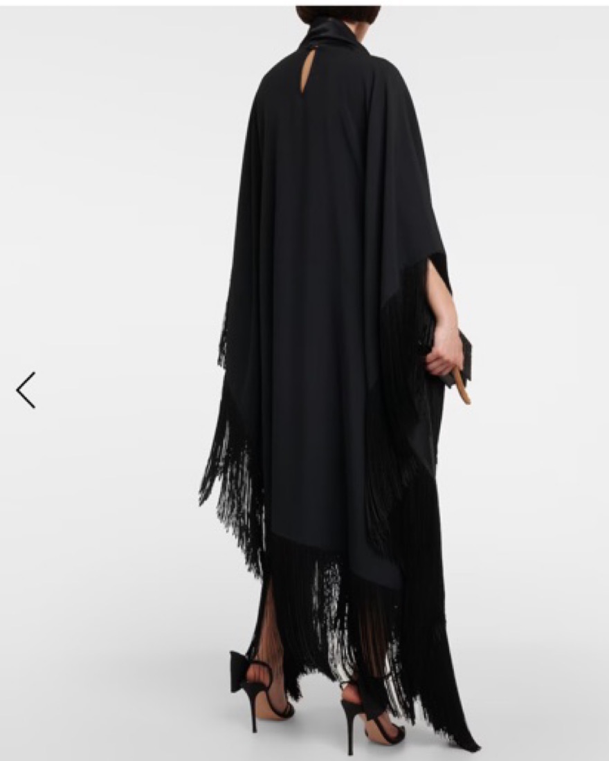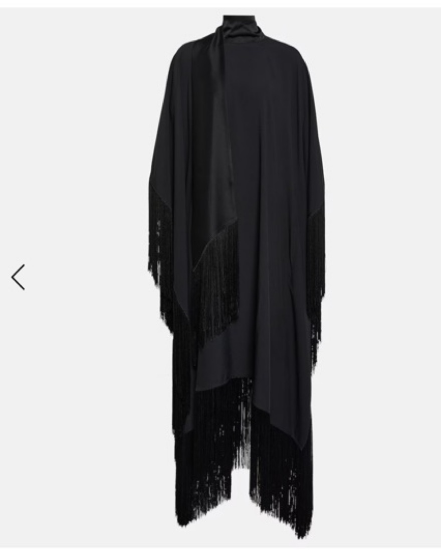 Mrs. Ross kaftan from Taller Marmo. Made from crêpe, the mock neck style boasts a voluminous silhouette and statement-making fringed edges.