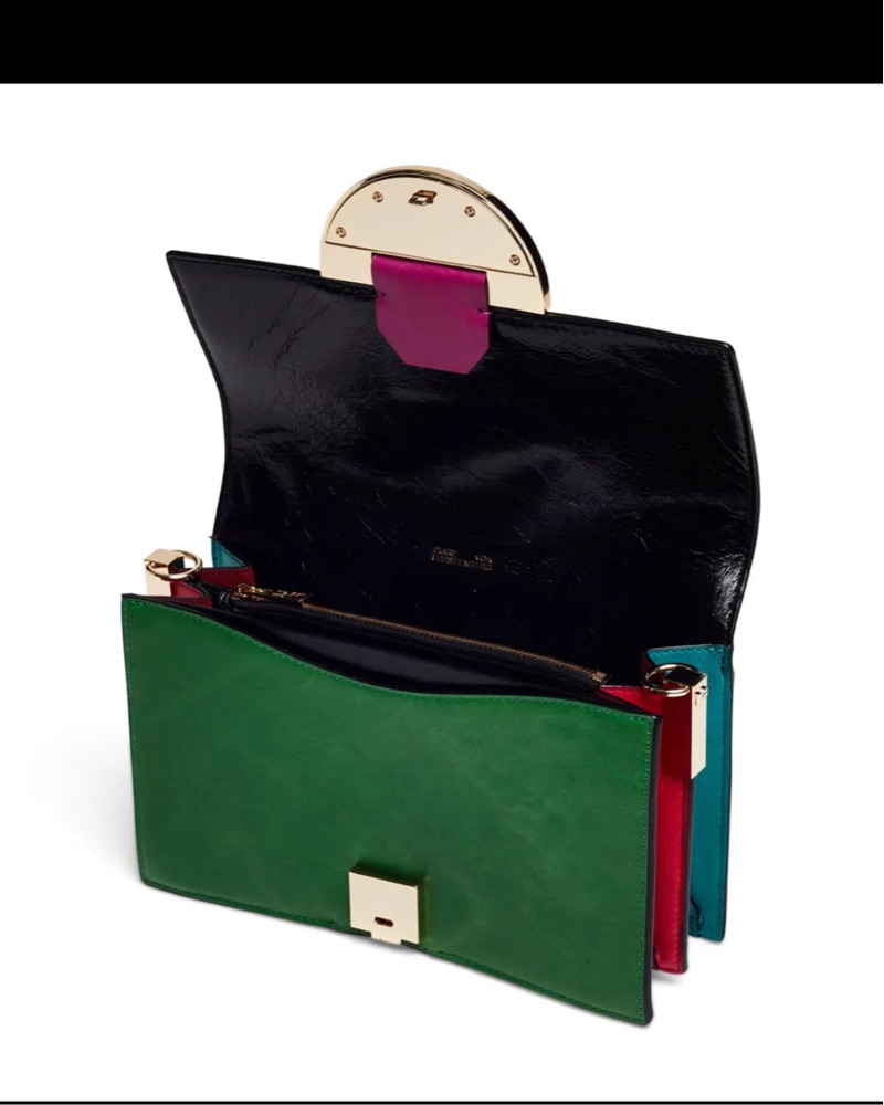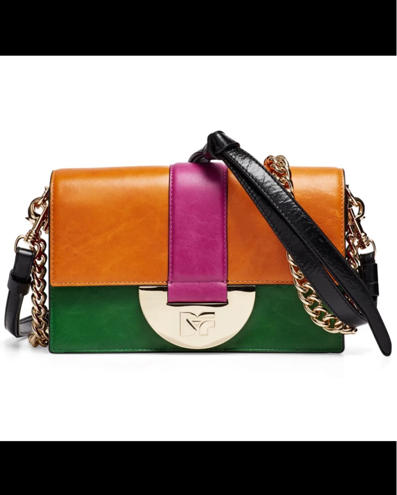 Cowhide leather shoulder bag with marigold, green, fuchsia, red, and blue colorblocking. Foldover closure with gold DVF hinged fron