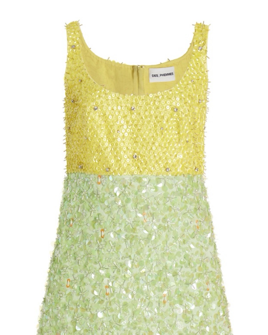 Exclusive embroidered satin mini dress. Made of sequin embroidered satin; this slim mini dress has a scoop neckline with a slight a-line silhouette.