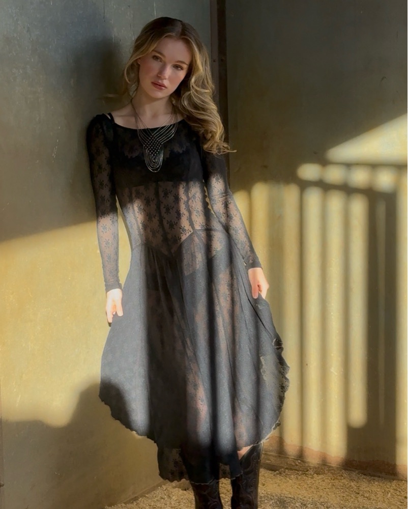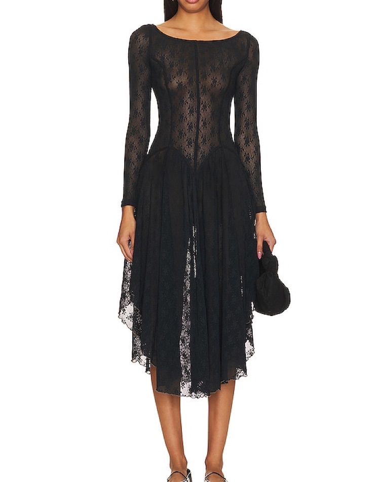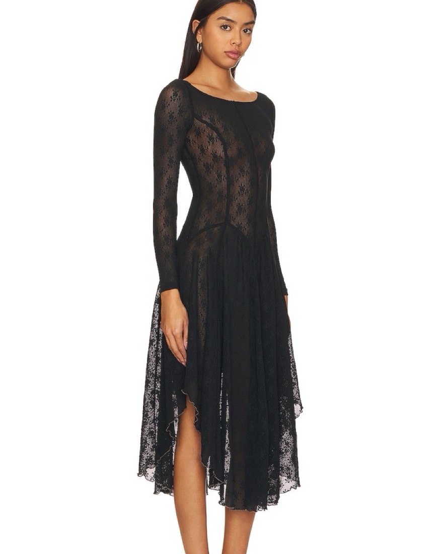 Black sheer lace dress, almost victorian style so cute! Does not have a slip or anything to go underneath. It is fully sheer. Free People and Revolve collab