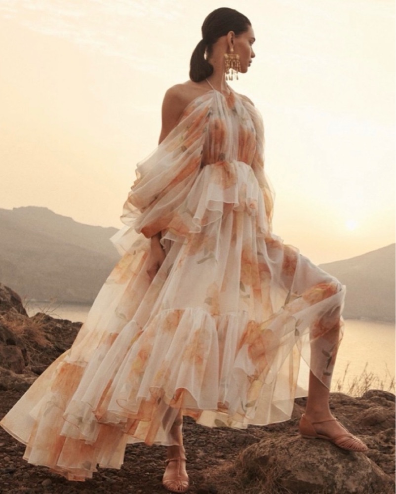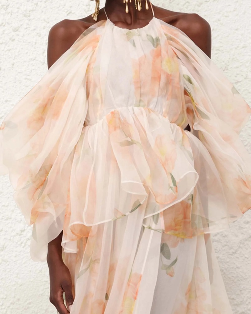 The midi dress features draped sleeves and floaty ruffles that enhance the shape.