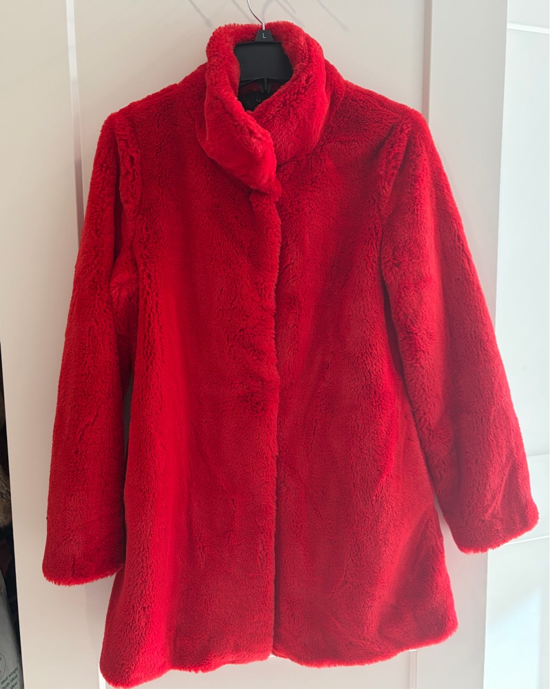 This stylish and warm faux fur coat in a vibrant red color is perfect for dressing up or down. Pair it with your favorite jeans and booties for a chic everyday look.
