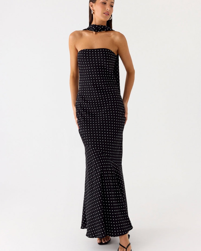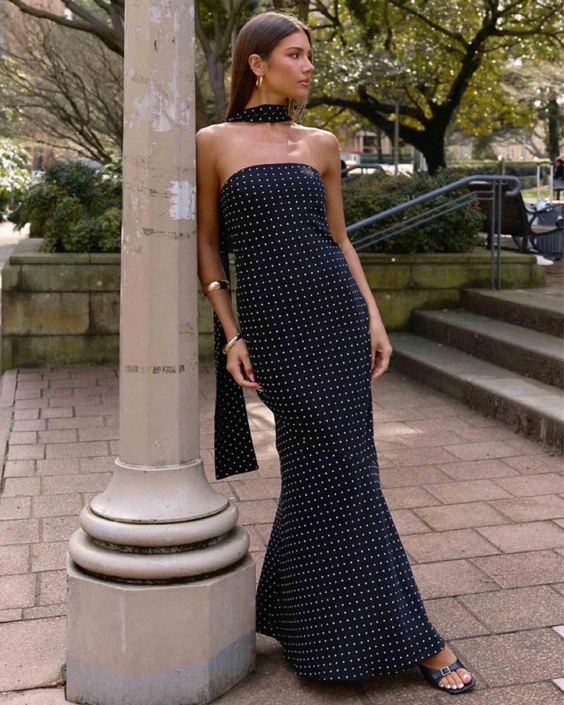 This elegant polka dot maxi dress is perfect for a evening event or special occasion. The halter neckline and figure-flattering silhouette create a glamorous look.