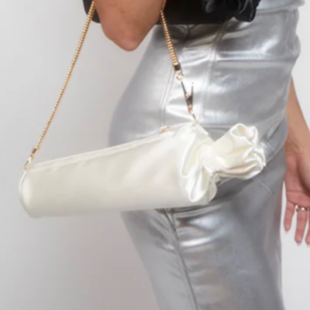 Satin bag with zip closure and unique structural shape