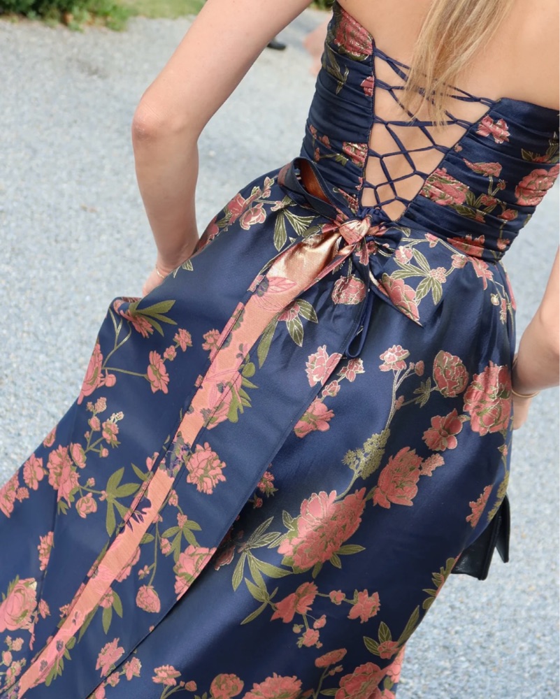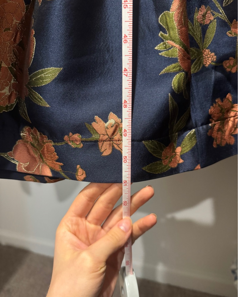 V Chapman full length Regina Dress in Navy Tudor Rose Brocade, size 2. This floral dress is gorgeous!! It has gold threaded accents and a slit. It has an adjustable corset back so it can fit size XS or Small well! It’s been hemmed and the total length from top of dress to bottom hem is 51”.
