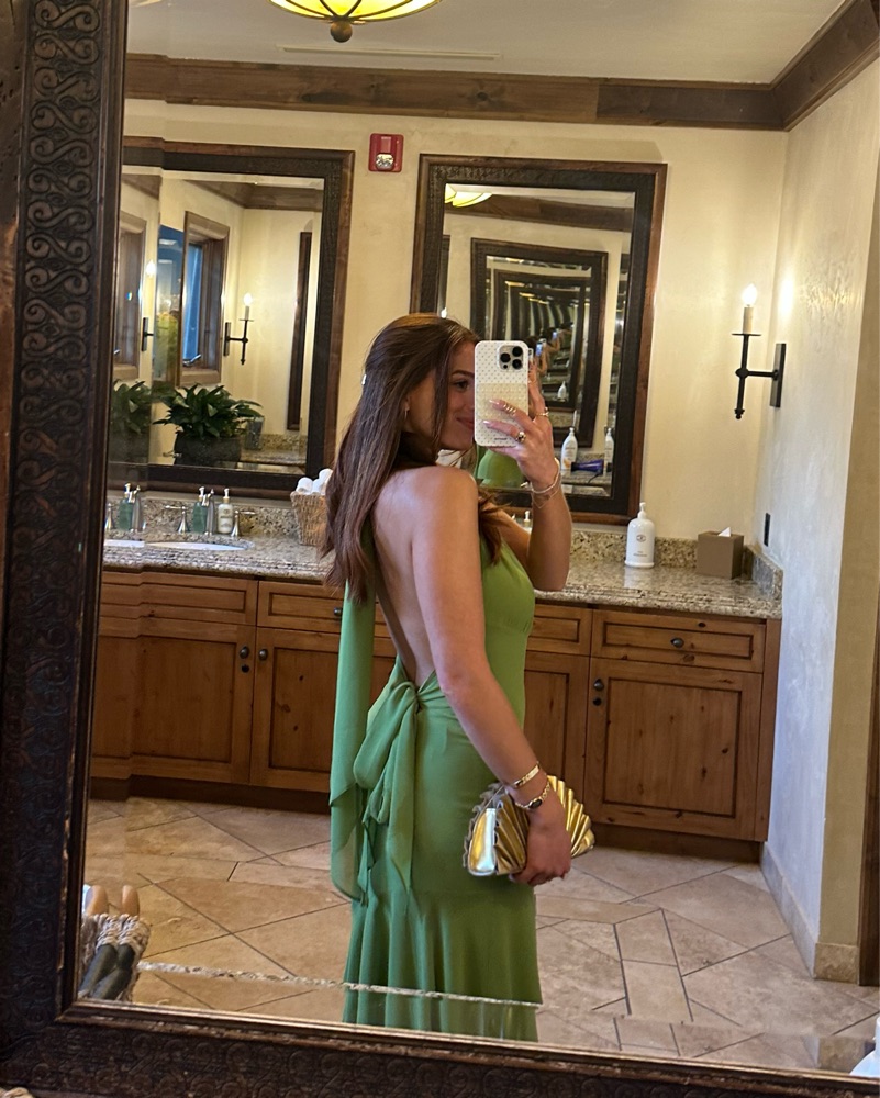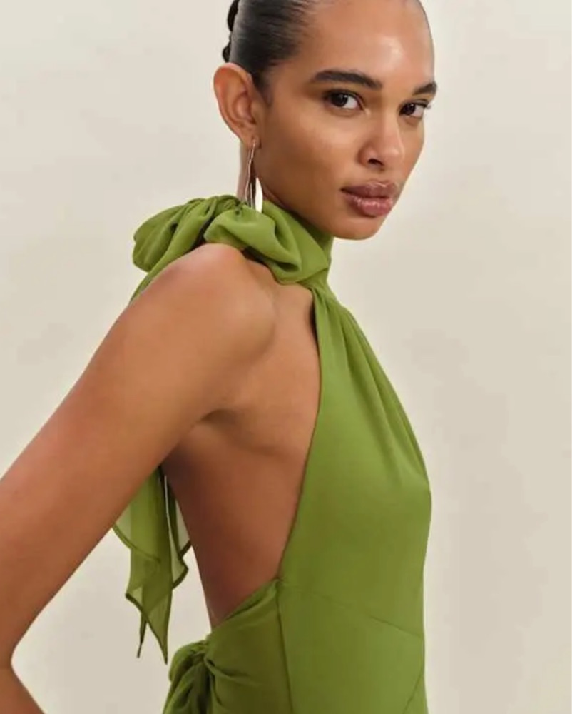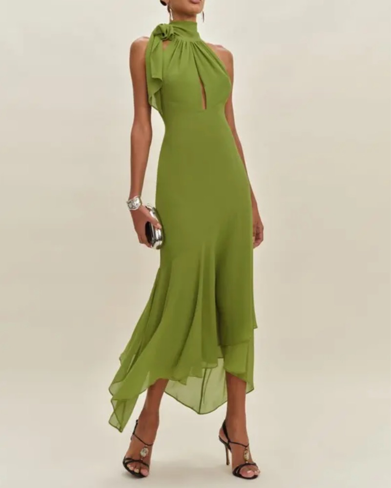 Beautiful chiffon-style layered dress with a mermaid style skirt, fitted through the waist and hips. Tie neck with keyhole detail in the chest, tie back & open-back. Wore to a wedding recently and got so many compliments!! Color is in « Parrot » (vibrant green). Size 6.