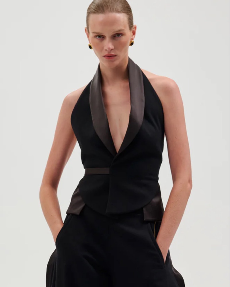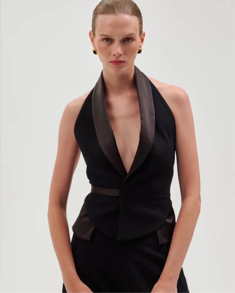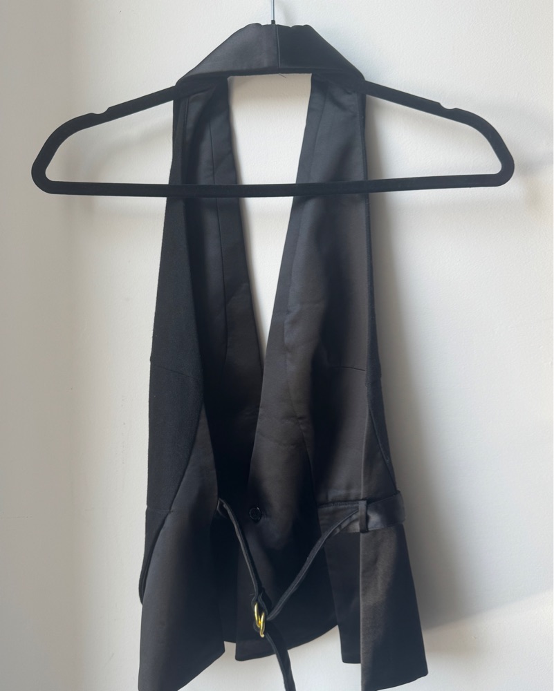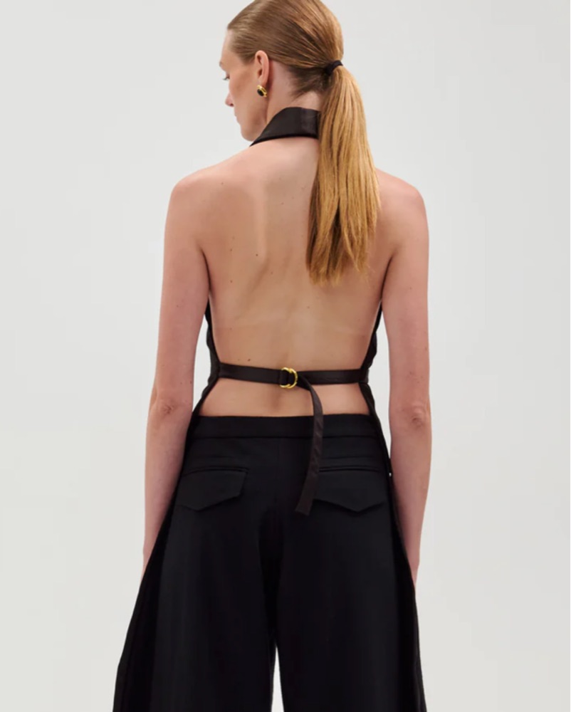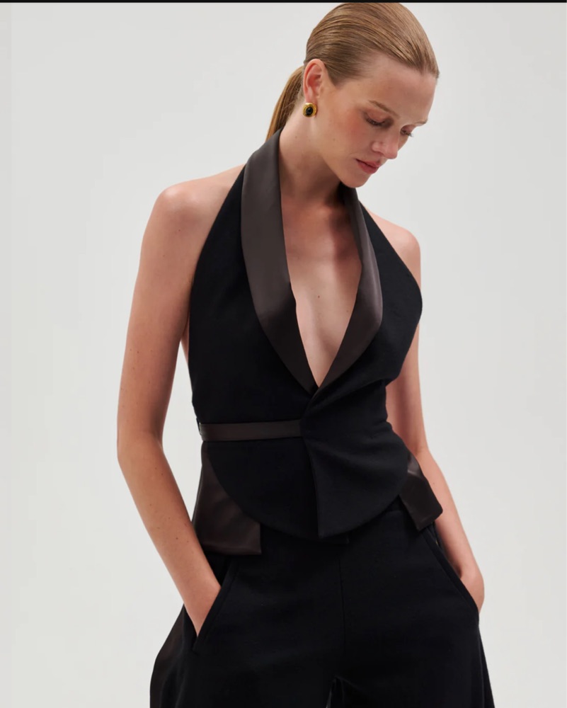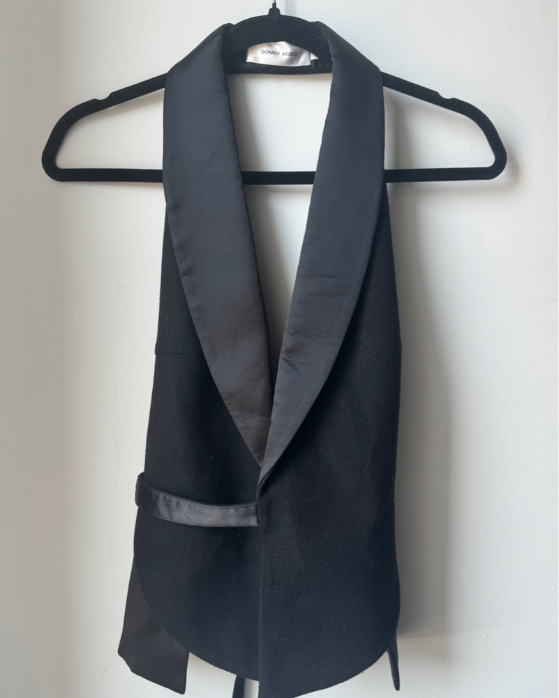 Tuxedo inspired halter top with satin lapel and felted suiting wool for the bodice. Backless halter with d ring closure. A sexy going out option for summer!