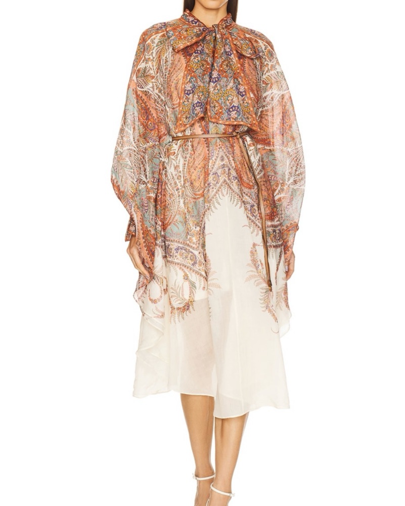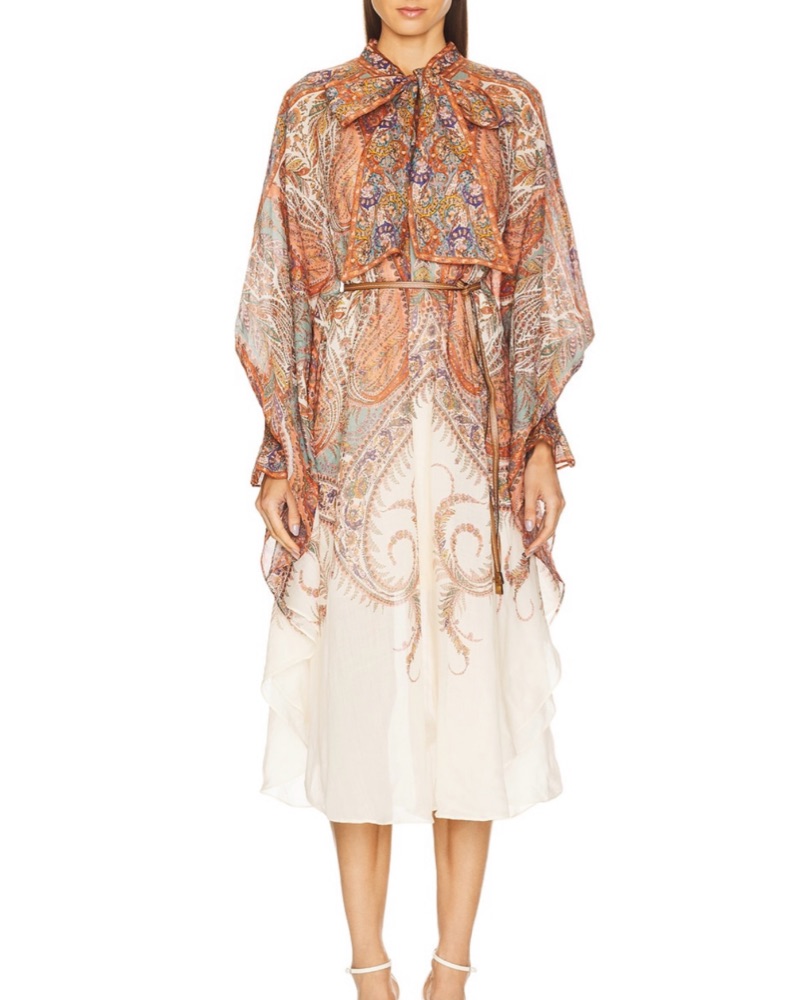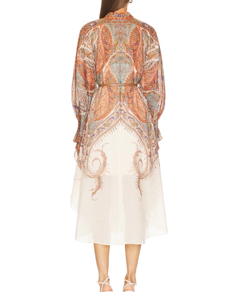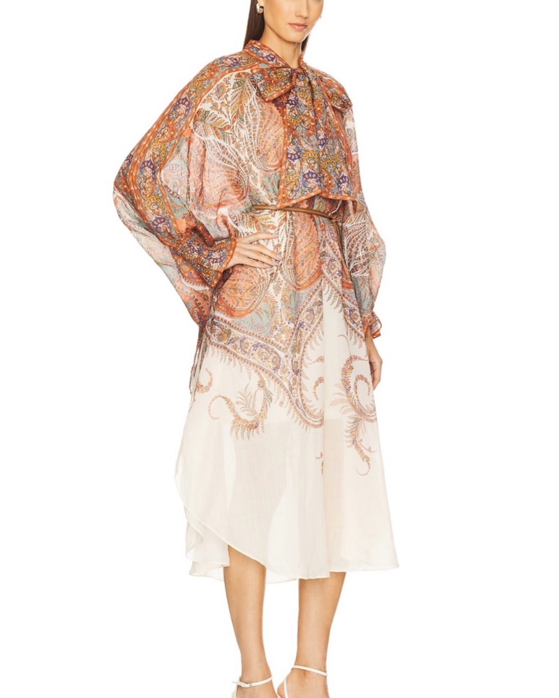 This eye-catching midi dress features a bold and captivating paisley print in a range of warm, earthy tones. The flowing silhouette and sleeves create a sophisticated yet whimsical look, perfect for a garden party or wedding.