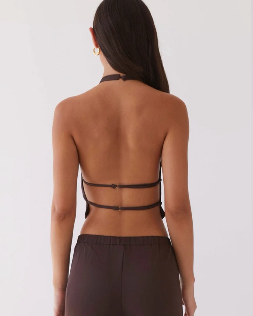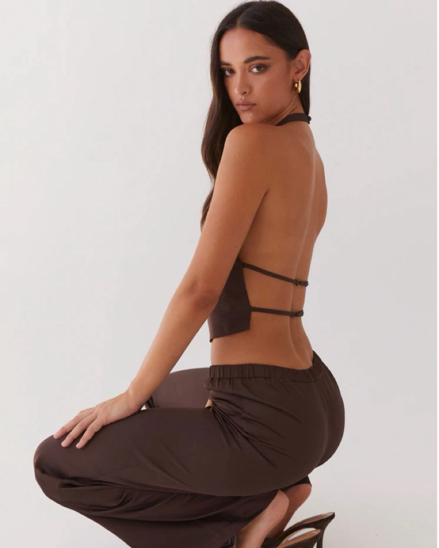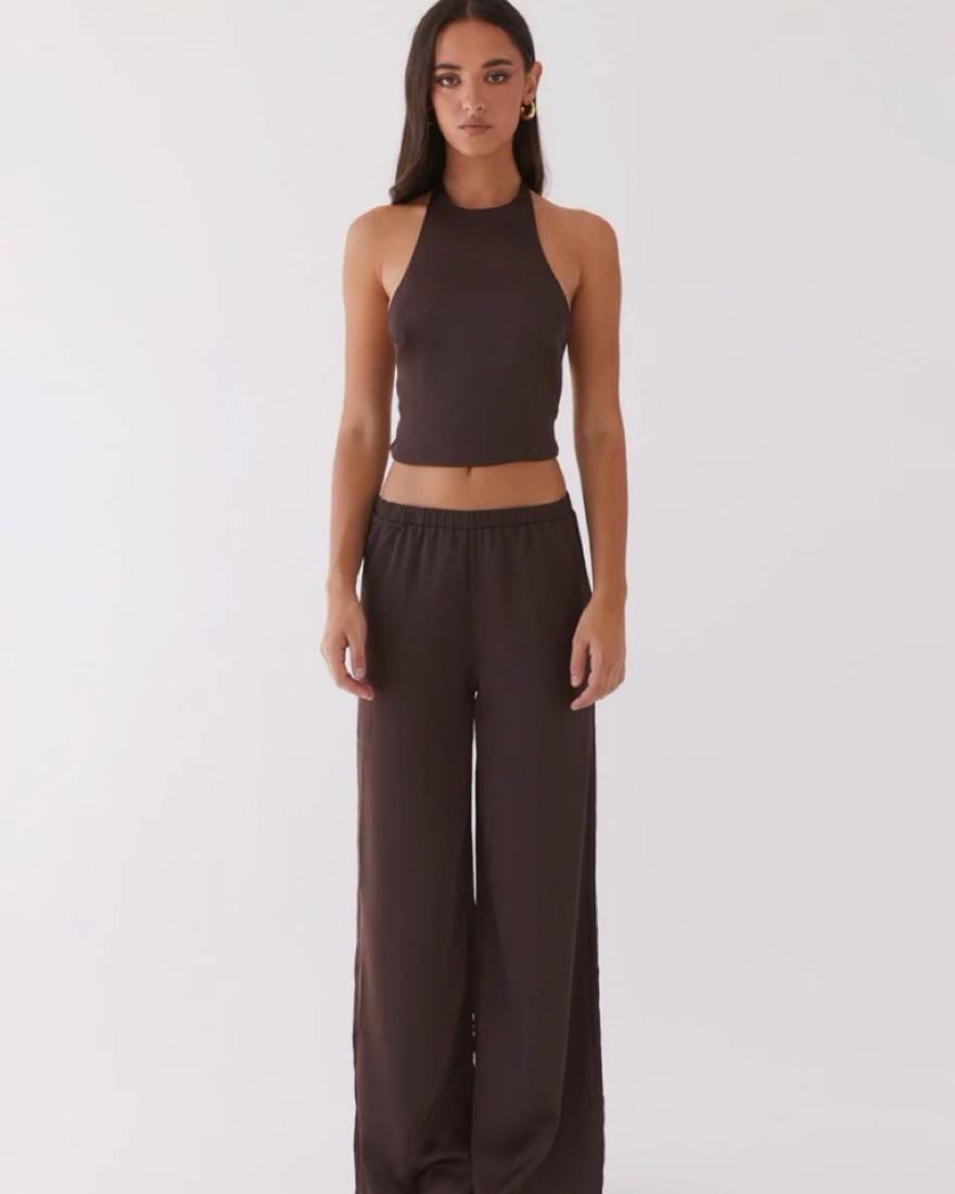Brown Backless halter top and matching low rise wide leg pants. Adjustable straps for the back. So chic and perfect for dinner/drinks