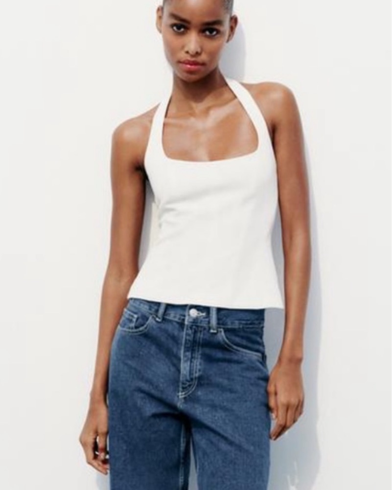 This sleek black halter top is perfect for a night out. Pair it with your favorite jeans or skirt for a chic, versatile outfit.
