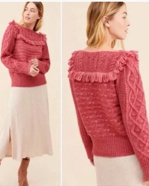This statement sweater is perfect for a romantic date night or special occasion. The textured knit and frilly details add a playful, feminine touch.