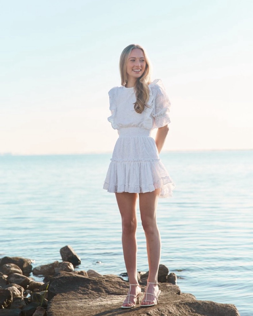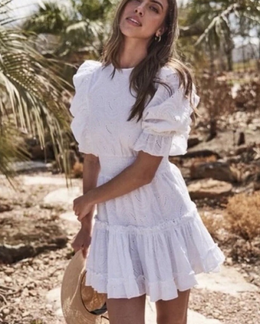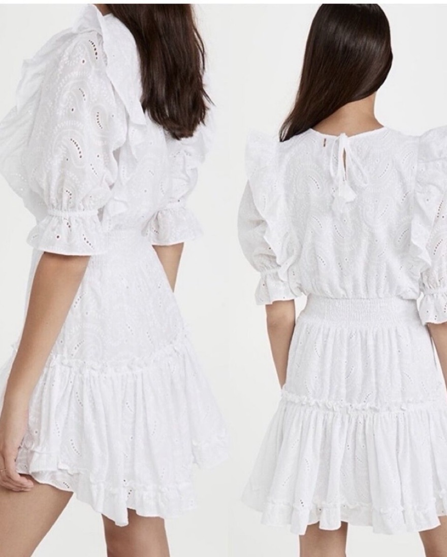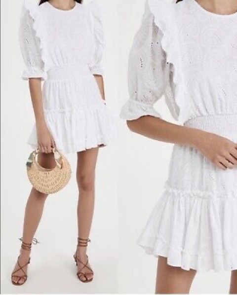 This beautiful white ruffle dress is perfect for any special occasion. The delicate eyelet fabric and puff sleeves create a feminine and sophisticated look. Size XS. Perfect for vacation or a bridal look.