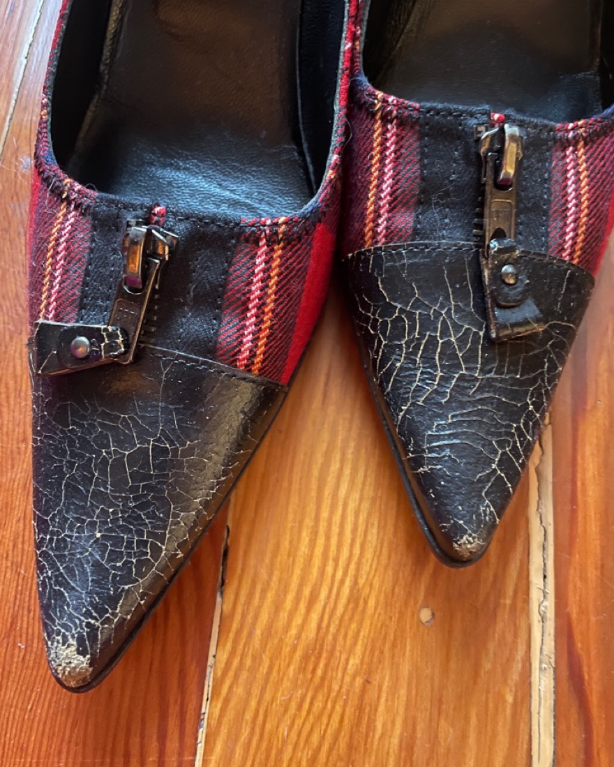 Fabulous vintage miu miu w zipper detail. Cracking on leather as a result of age but it looks cool. Size 9, fits true to size