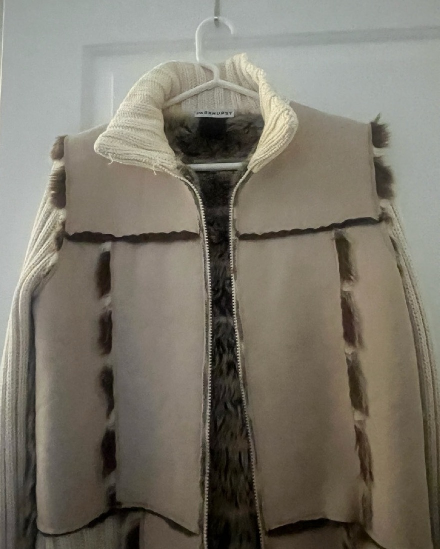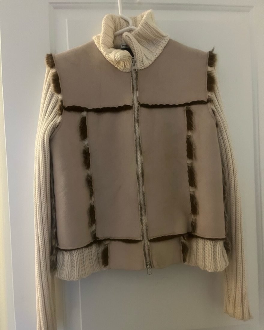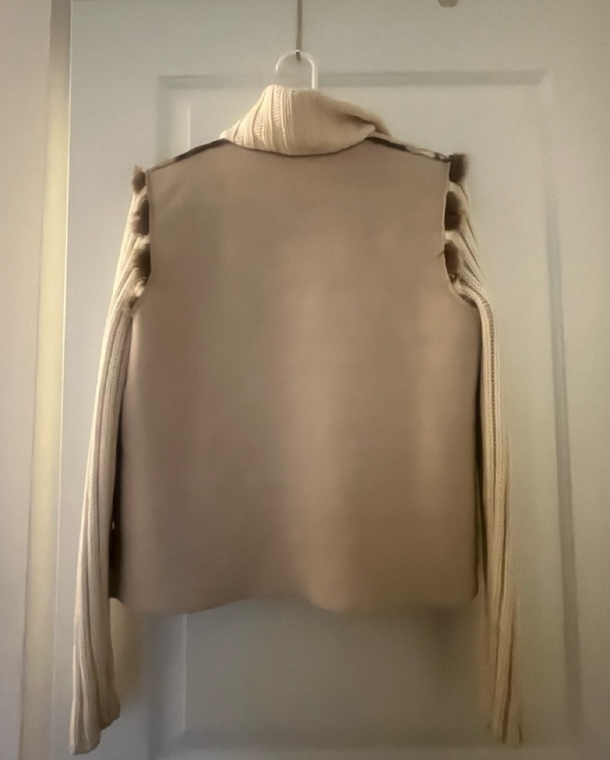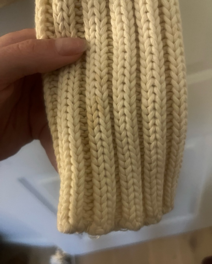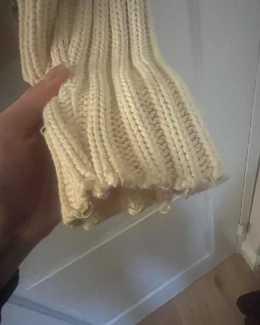 Mild fraying and hint of former coffee stain at sleeve (pictured as best as possible). Not super visible unless you know to look for it IMO but definitely there.