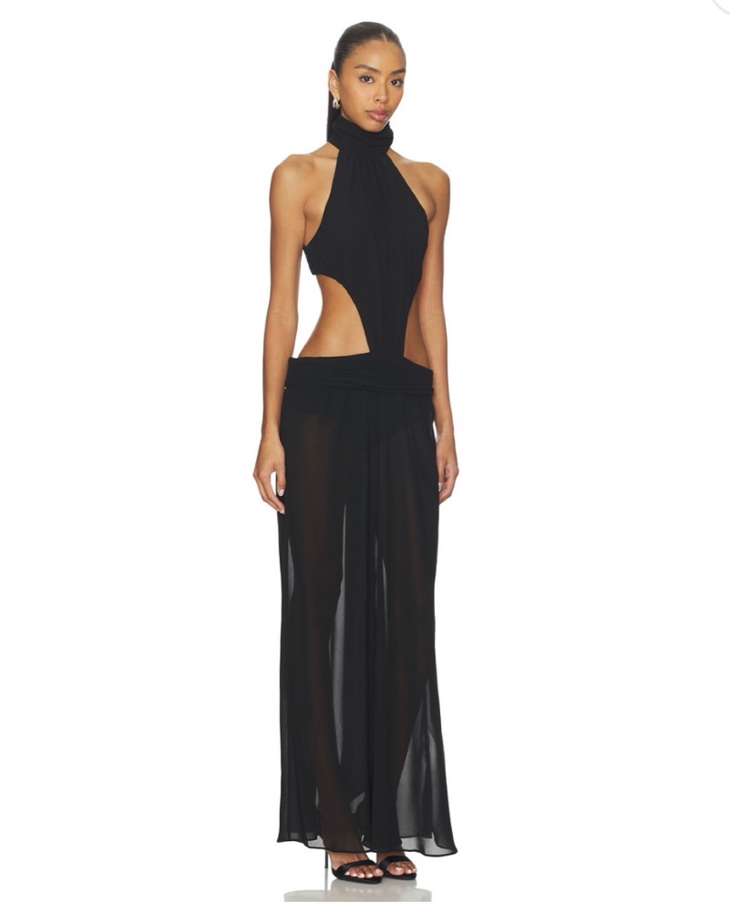Super chic black maxi dress, sheer bottom, perfect for vacation or an event.