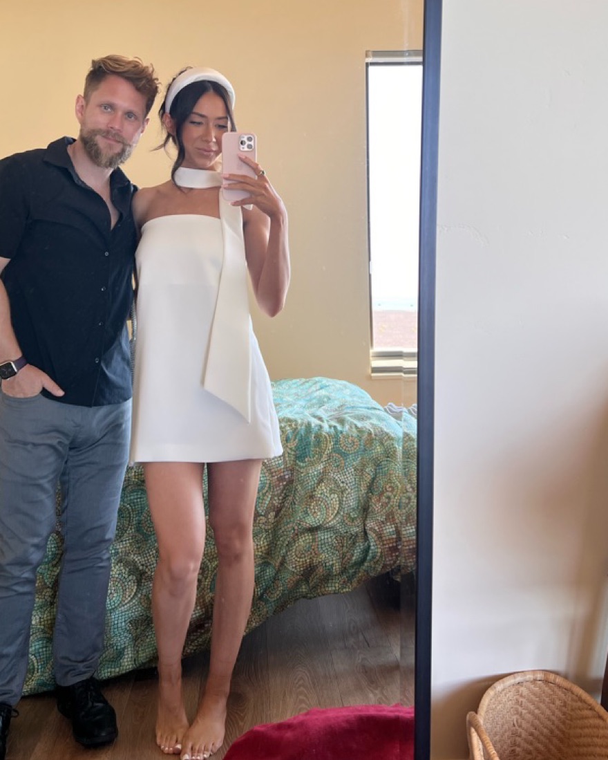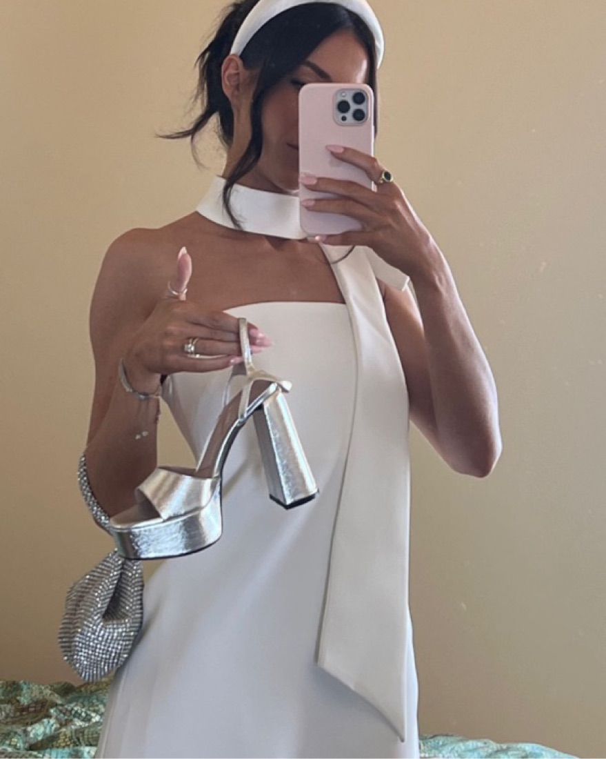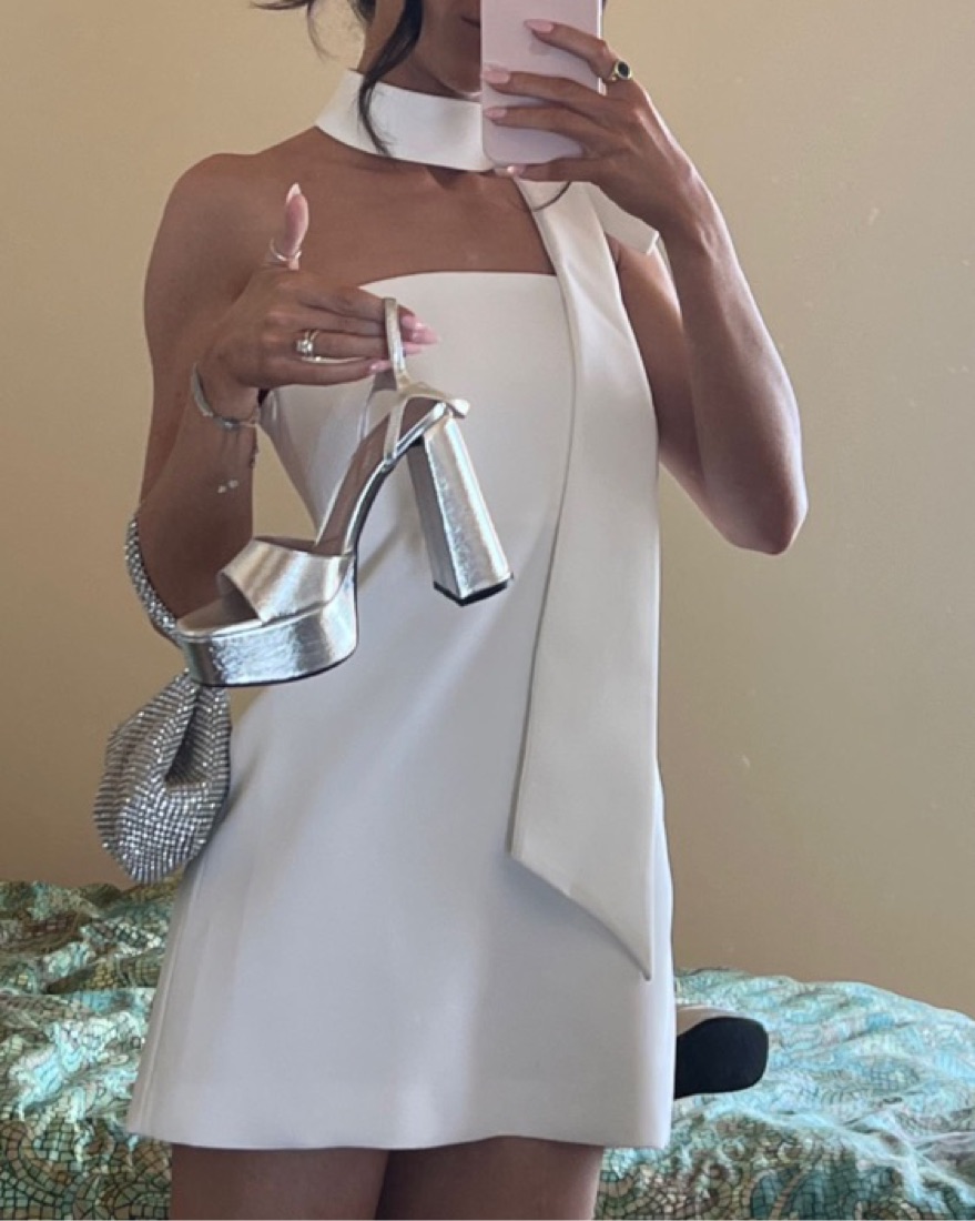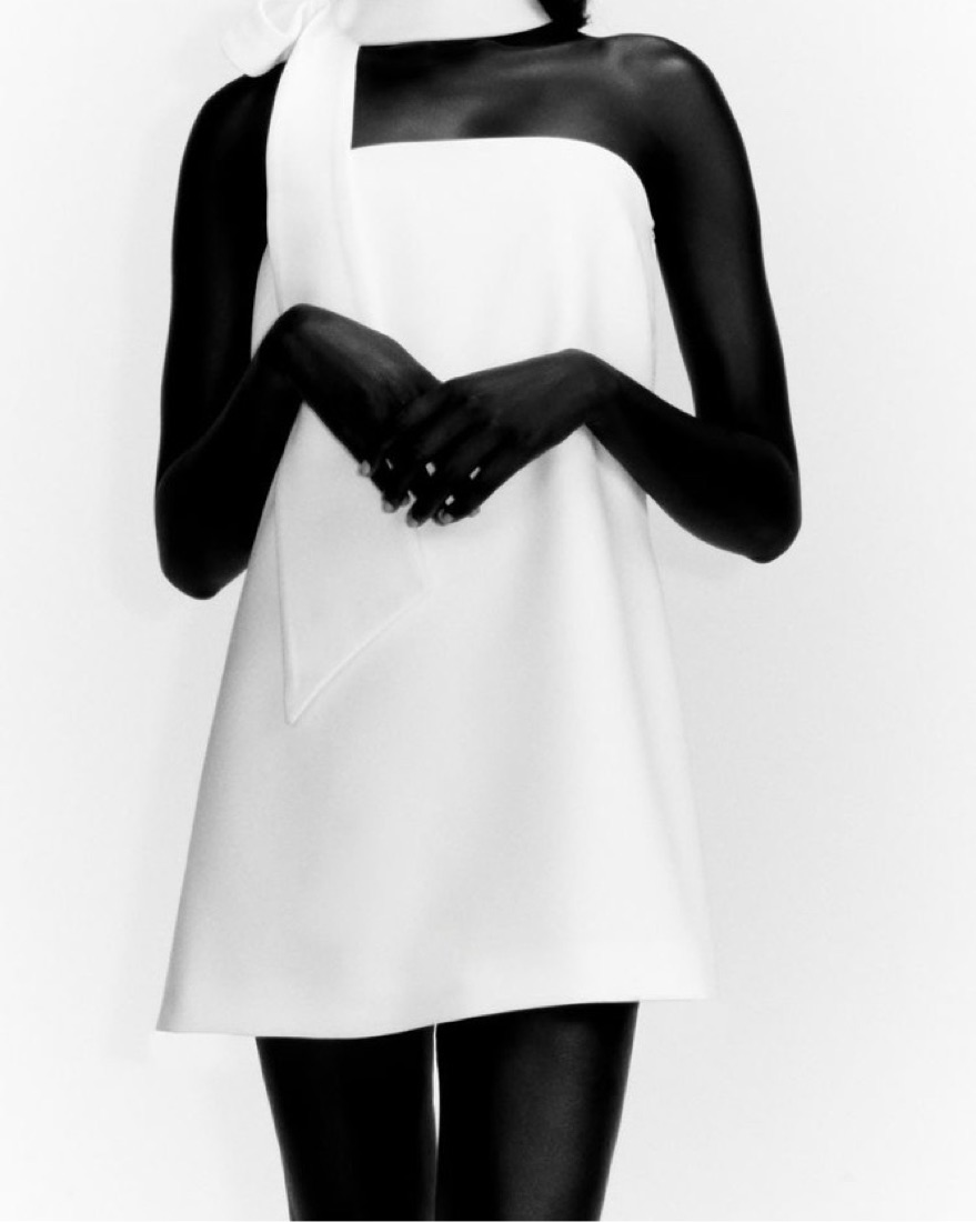 “choker mini dress” in oyster white. No longer sold at zara. I had it taken in to be less baggy and wide and also hemmed to be shorter, but I’m 5’7” so unless ur taller than that it won’t be too short.