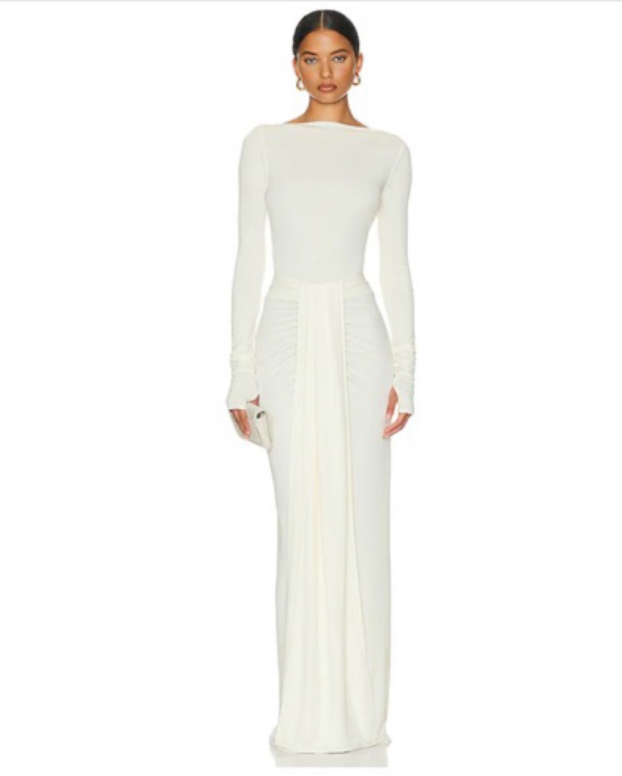 Off the shoulder and long sleeves with thumb holes. Sleeves are really long so they will scrunch. Skirt & Set available for rent on profile.