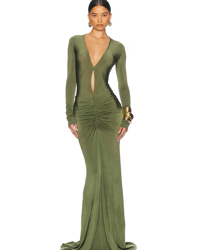 helsa natasha geeen ruched maxi dress in a slinky/stretchy material.