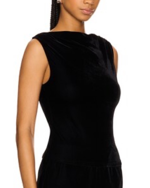 This luxurious velvet top is perfect for a formal event or special occasion. The sleeveless design and flowing silhouette create a sophisticated look.