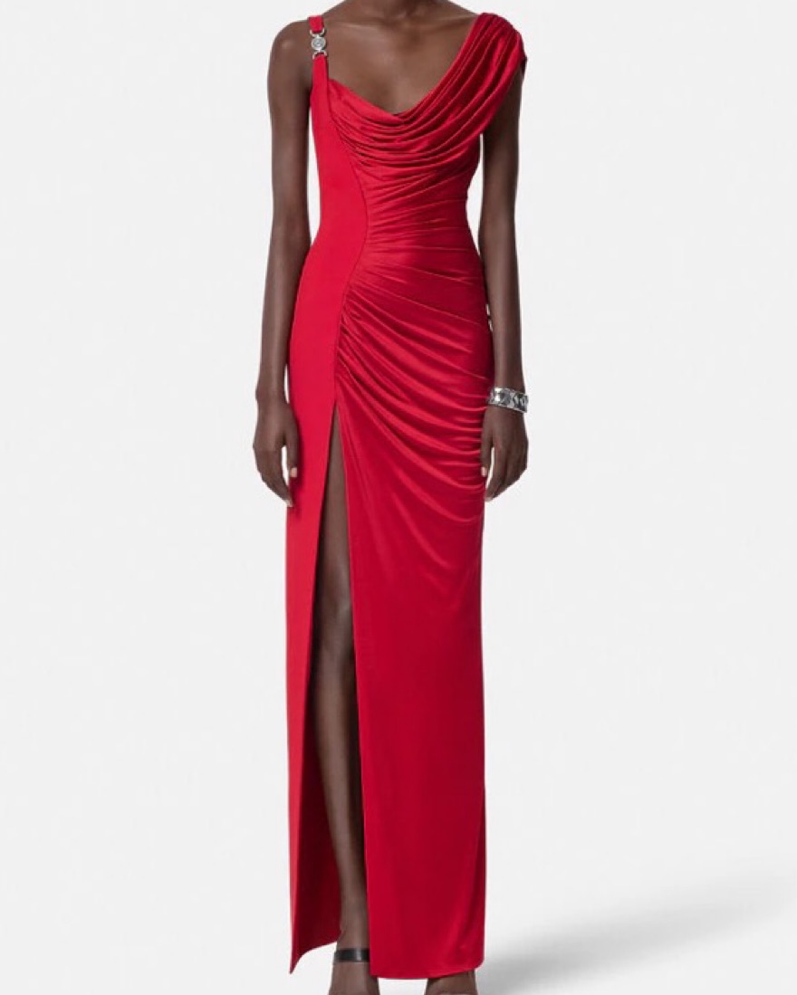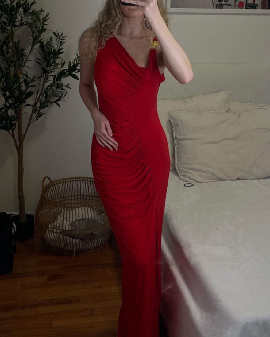 This red draped gown is perfect for a glamorous evening event. The figure-flattering silhouette and luxurious fabric will have you feeling confident and elegant. Would fit a true S or M the best. Thin breathable fabric. The Versace plastic detail on the shoulder is gold not silver 💚