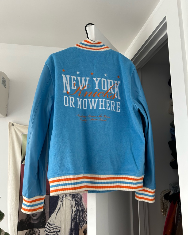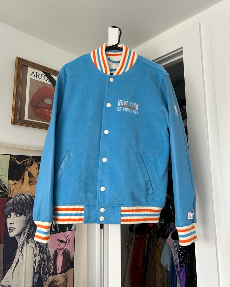 This stylish and cozy varsity jacket is perfect for a night out or a casual weekend. The bold graphics and vibrant colors add a retro-chic vibe to any outfit. Button closure, no zipper. Men’s sizing. Wool and leather.