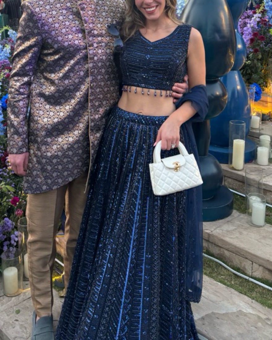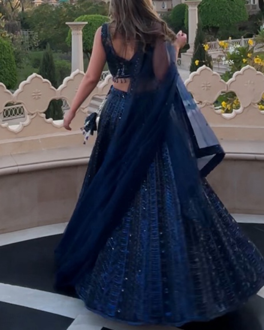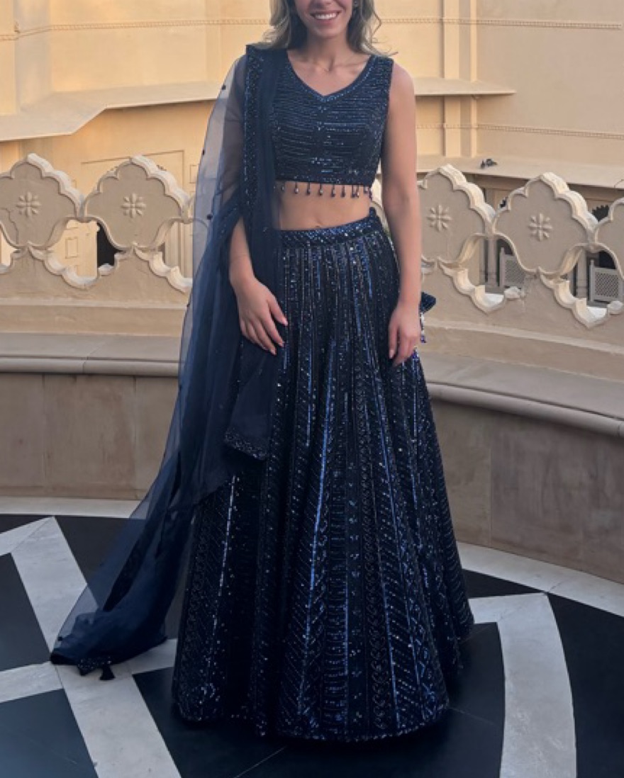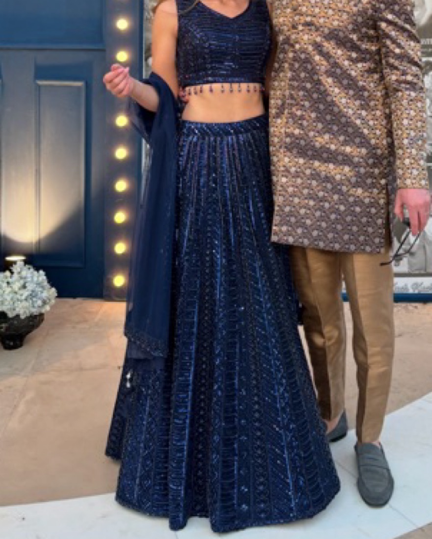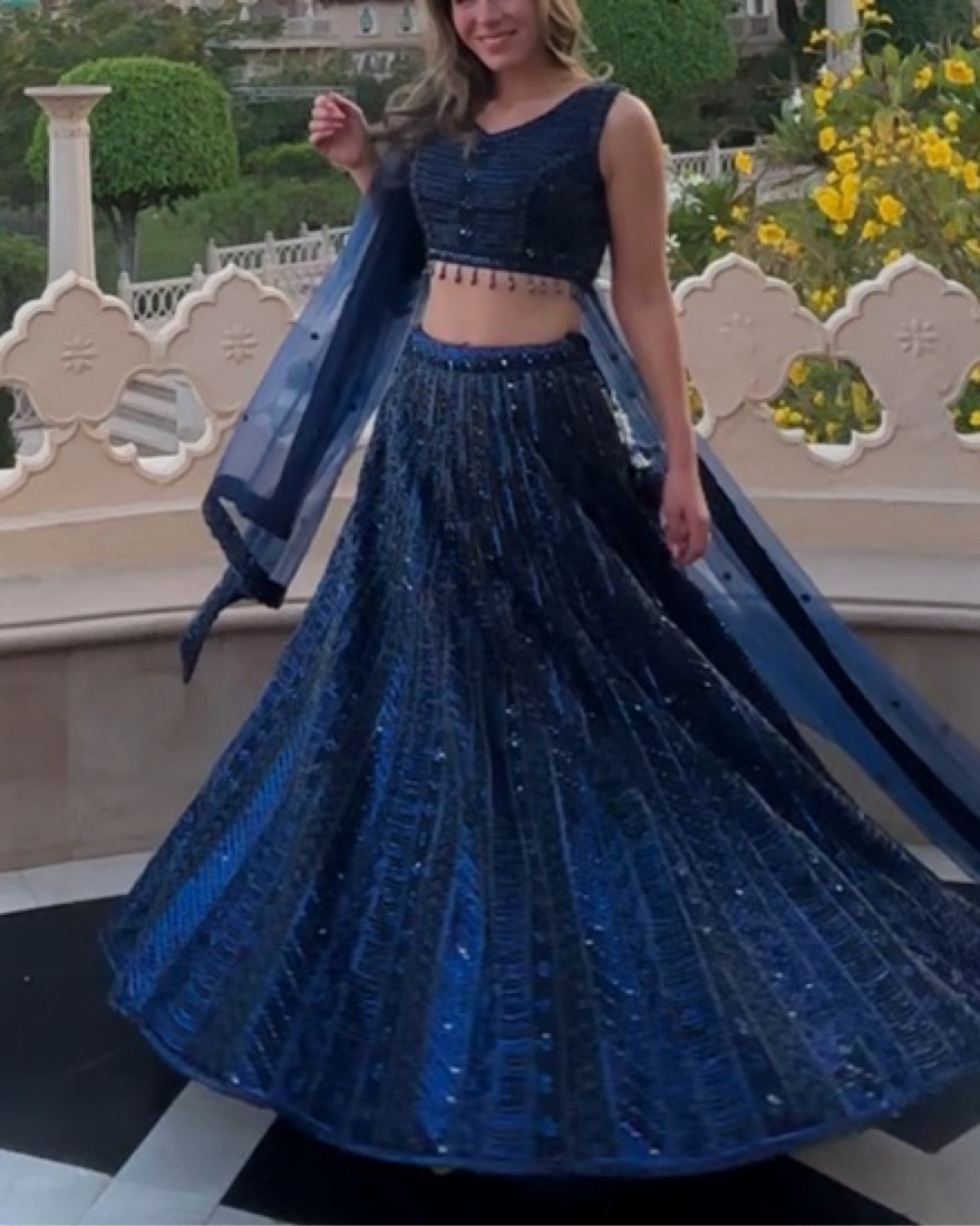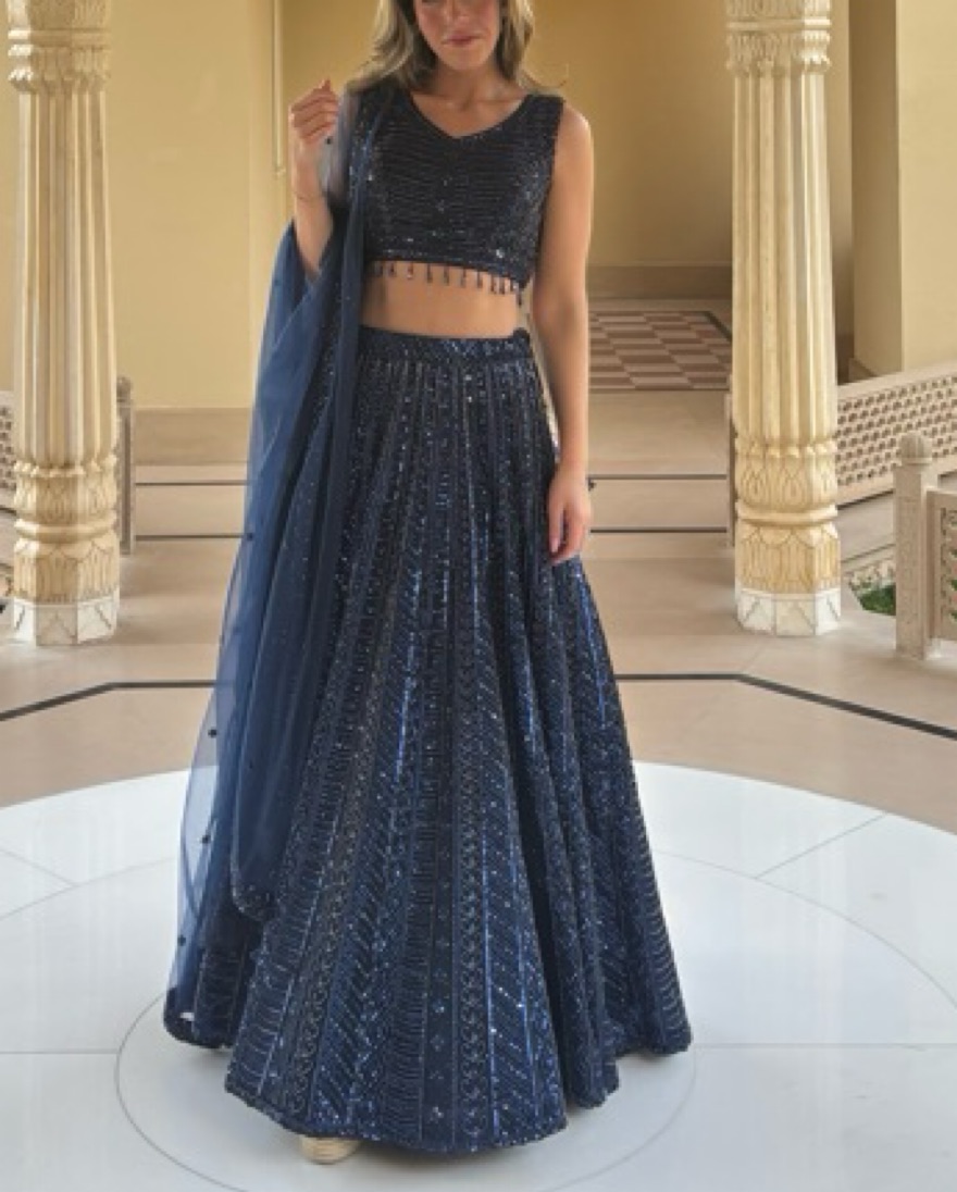 Navy blue lehenga with gorgeous beading. Sparkles in the light! Adjustable skirt. Top would fit small-medium and has a zipper. Comes with scarf. Perfect for Indian wedding, sangeet, etc.