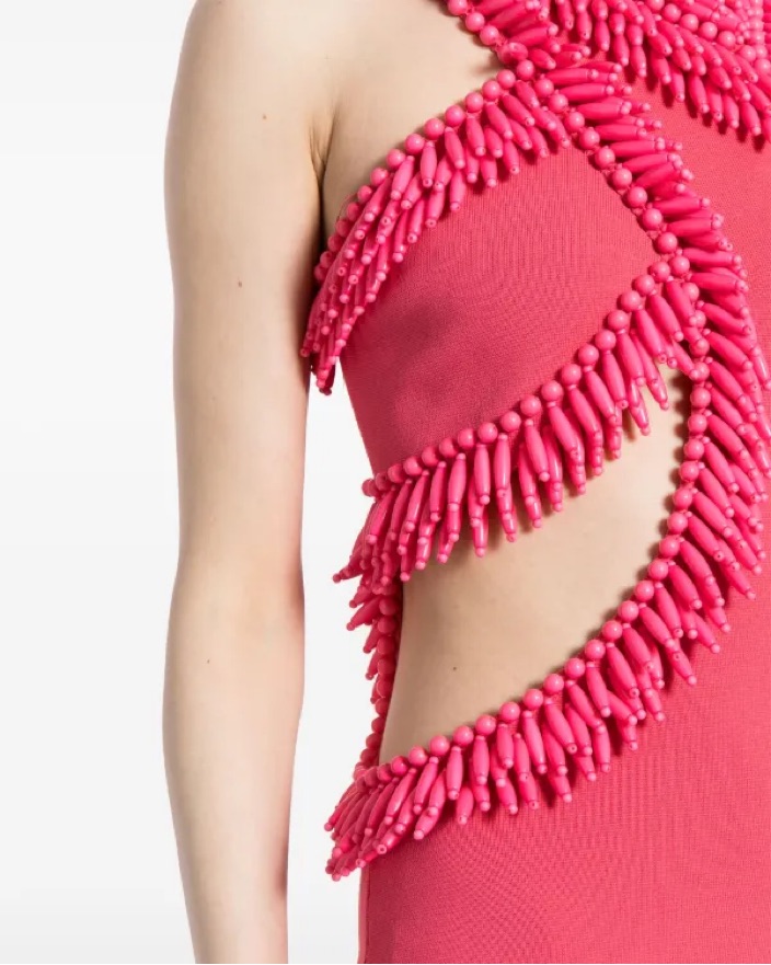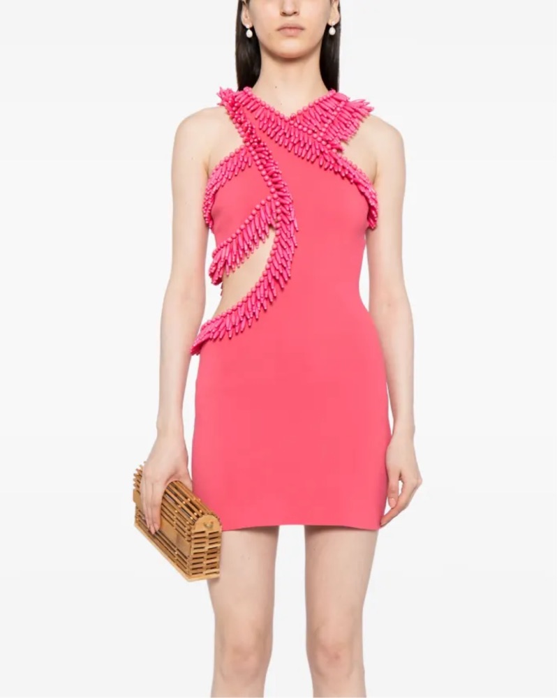 This eye-catching fuchsia dress features an intricate ruffle design that adds a playful and stylish touch. Perfect for a night out on the town or a special event.