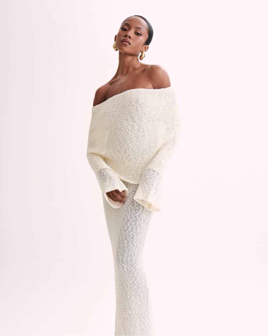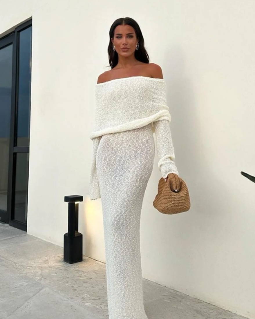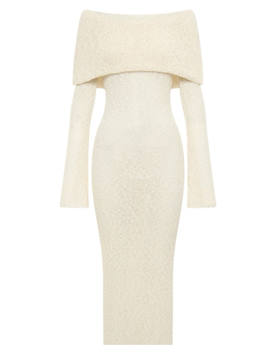 MARISOL is a ribbed design boucle dress that is both flattering from up close and across the room. The natural stretch of the fabric creates a figure-sculpting silhouette, while also featuring a unique drape-styled, off-shoulder neckline combined with flared long sleeves.