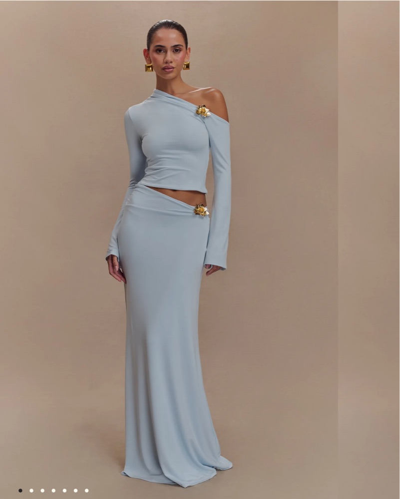 This one shoulder baby blue top and skirt set are perfect for a formal event, vacation or a special evening out. Golden accents elevate the look. Top is S and the skirt is S.