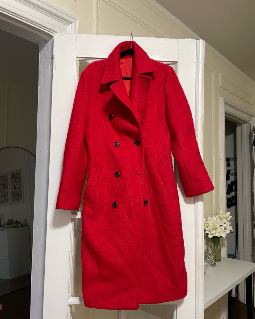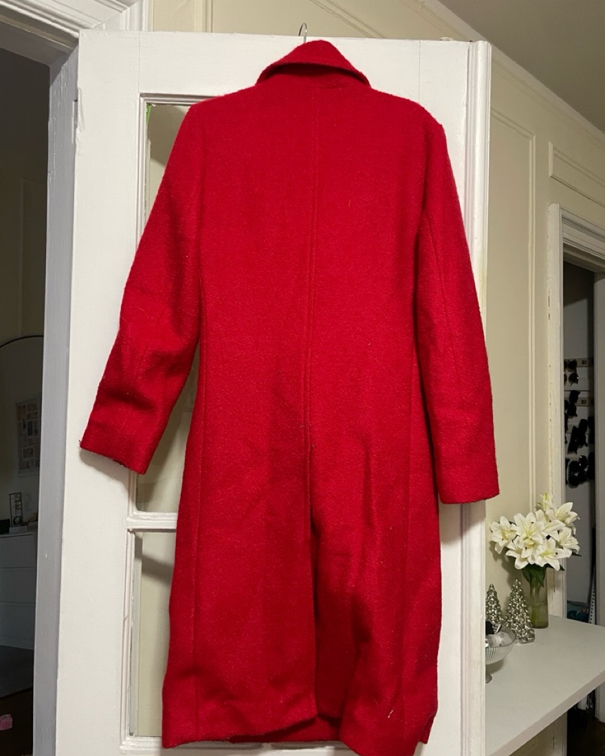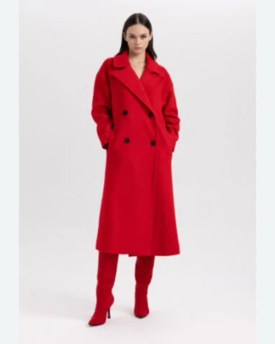 This stunning, high-quality wool coat in a bold, vibrant red tone is a true standout piece. It features a classic double-breasted silhouette with a chic collar and tailored construction for a polished, sophisticated look.