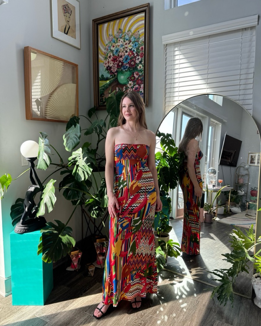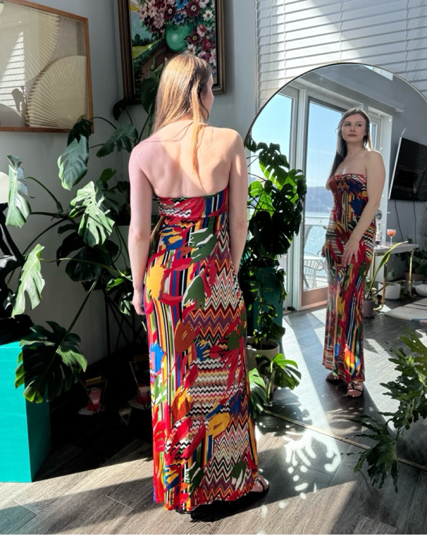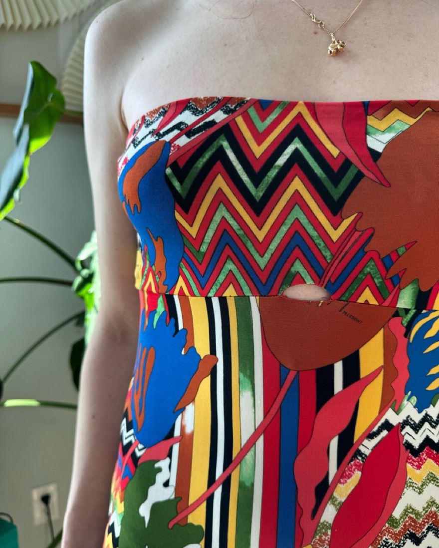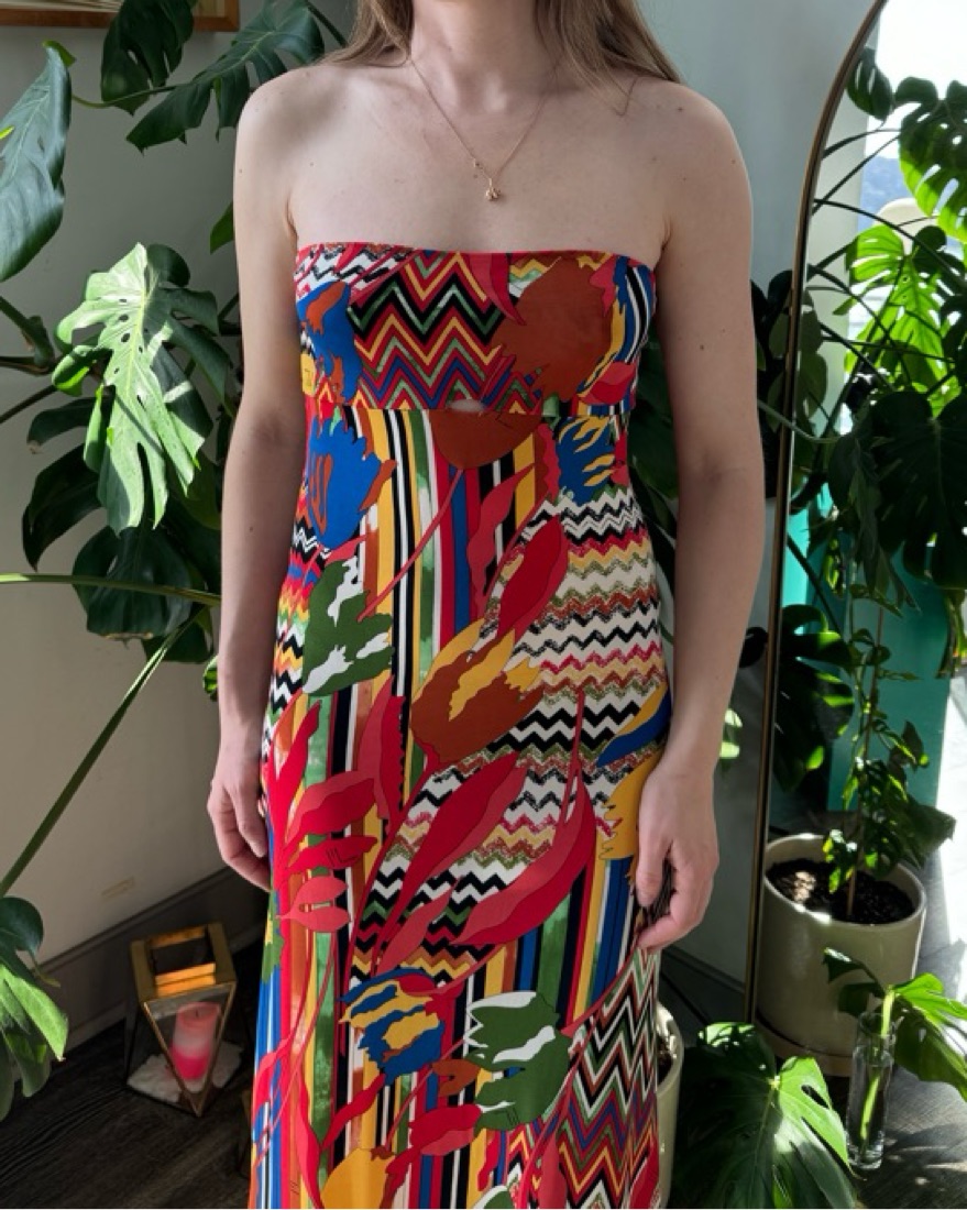 Description: M Missoni multi-color mixed print strapless maxi dress.