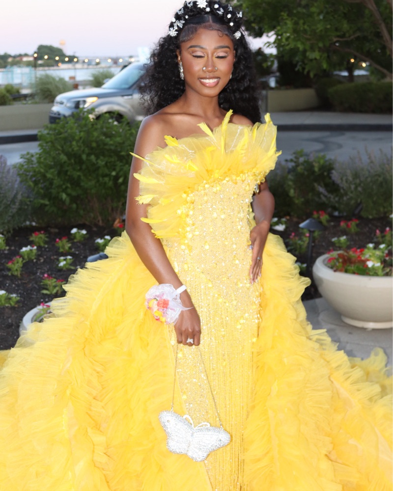 A yellow crystal and beaded dress with a detachable ruffle train.