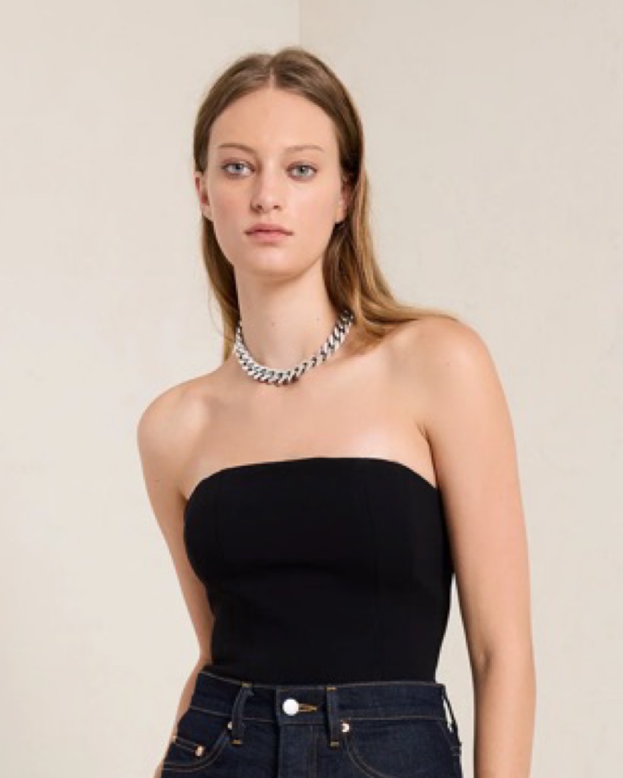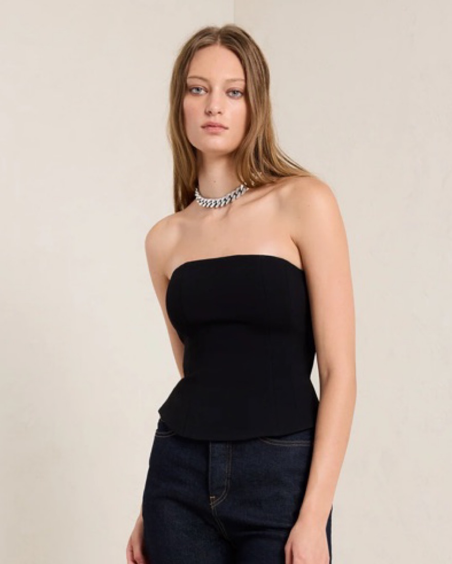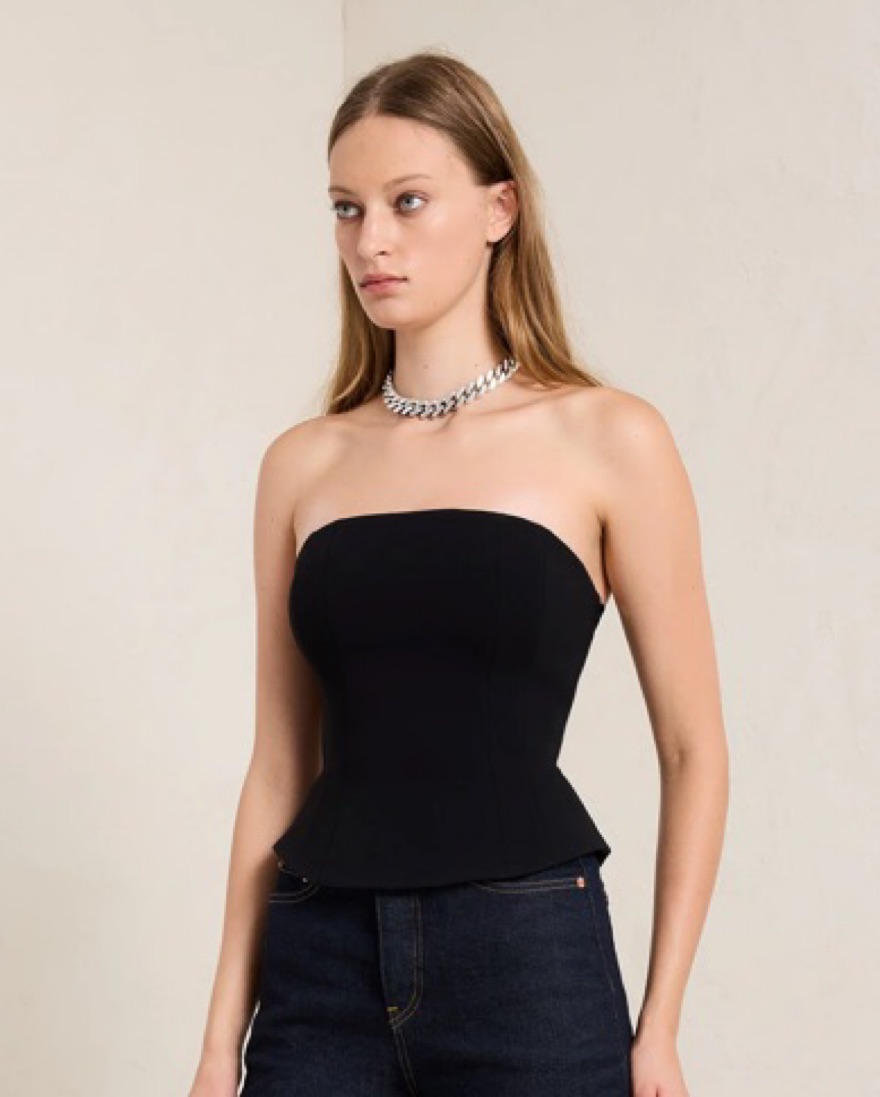 The Elsie Top is impeccably cut from matte black fabric. This corset-inspired silhouette is strapless, featuring bone corsetry, darted seams and a slight peplum that can be tucked in