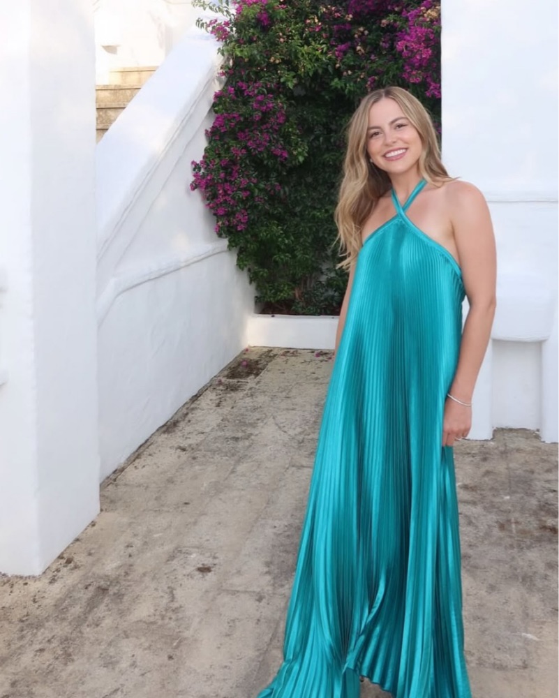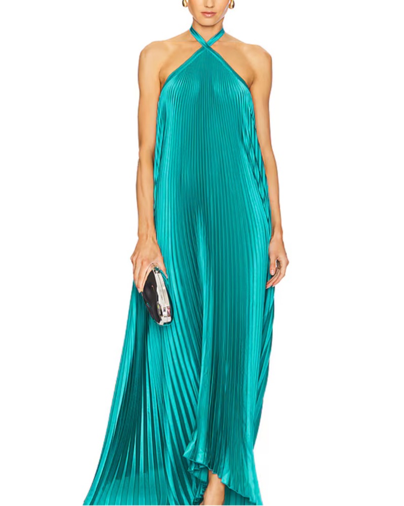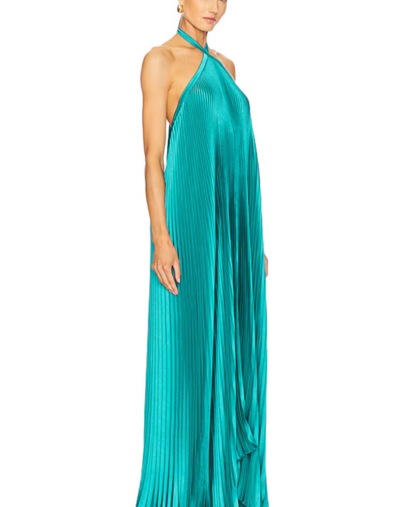 Pleated, teal formal gown. Halter tie neck closure. Loose fitting with a tie neck, so room to breathe and size up or down