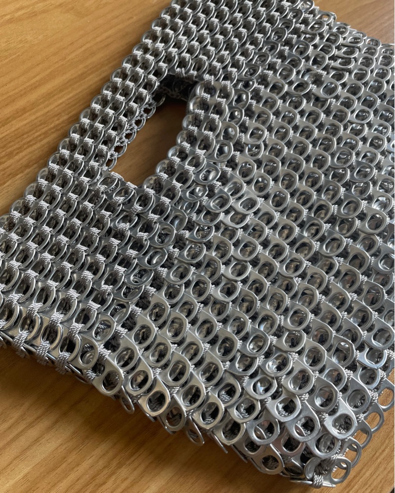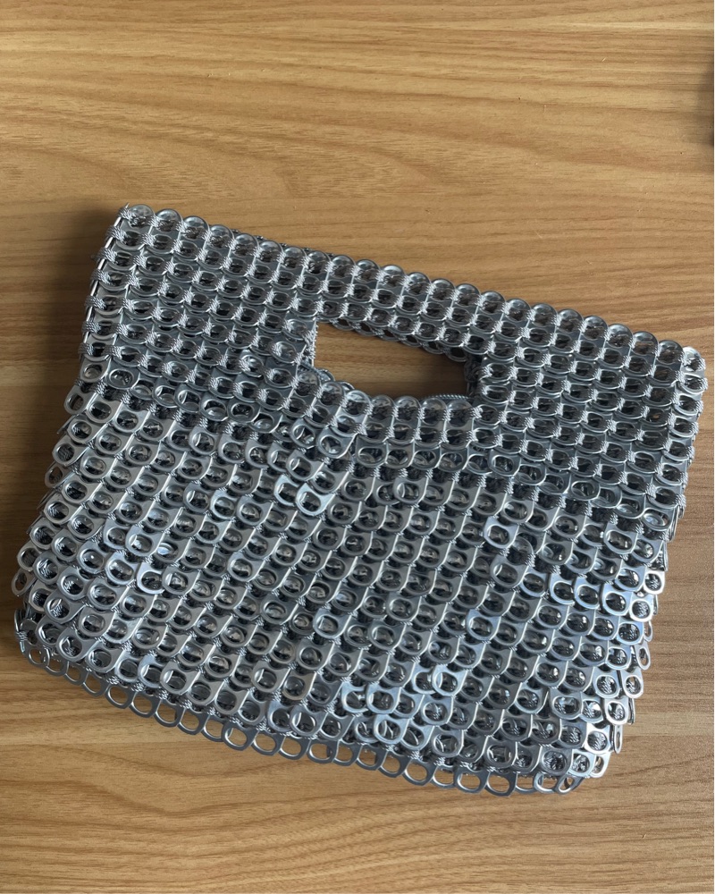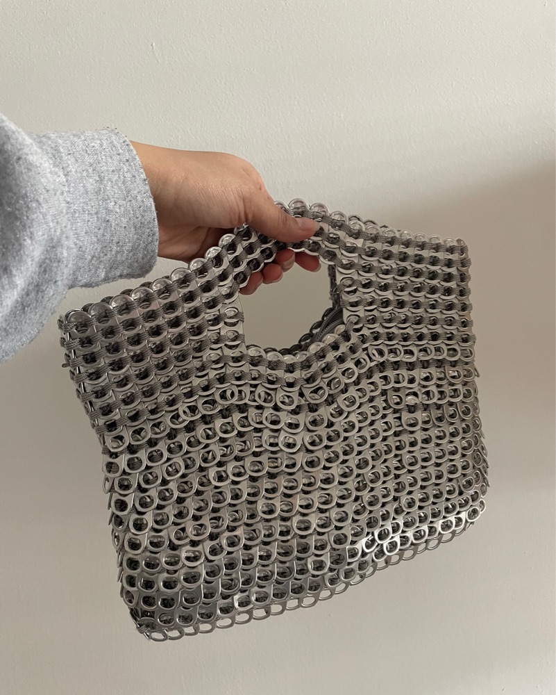 This stylish silver mesh clutch is the perfect accessory for any formal event or night out. The unique metallic design adds a touch of elegance and sophistication to any outfit. Like the Paco Rabanne bag!