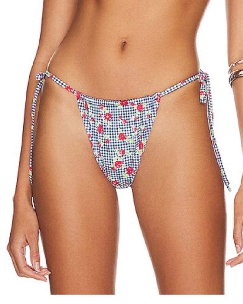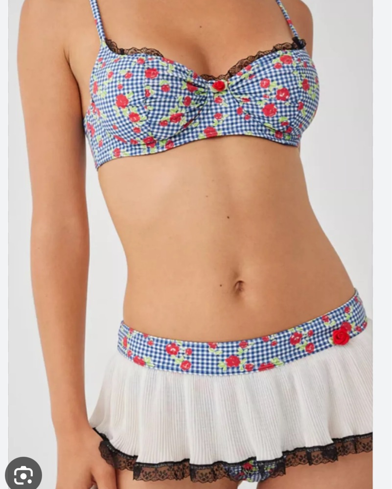 Frankie’s X Guizio bikini set! I have the bra swim top in a size xs and the swim skirt bottoms in a size M (although they fit me as a 25” waist, 36” hip). I also have the matching thong bottoms in an S that I’ll include!