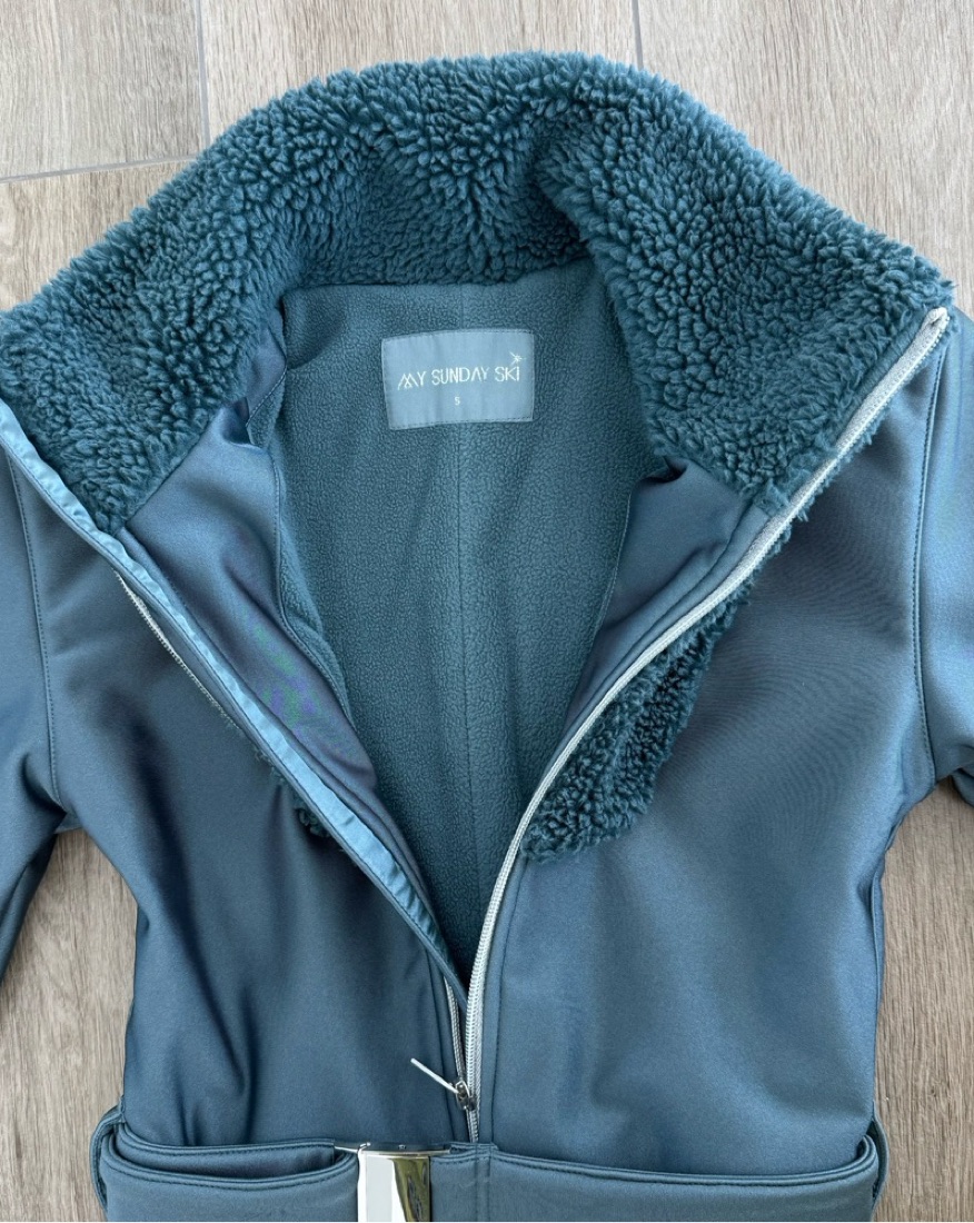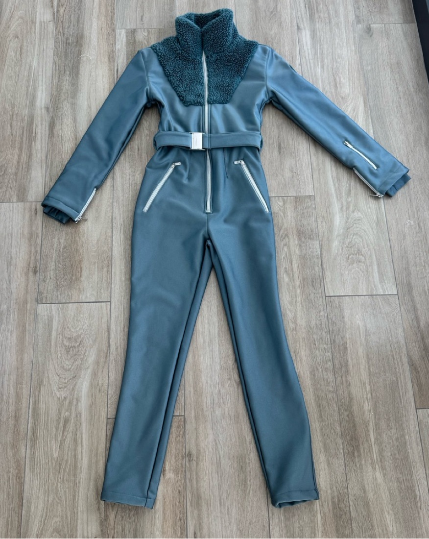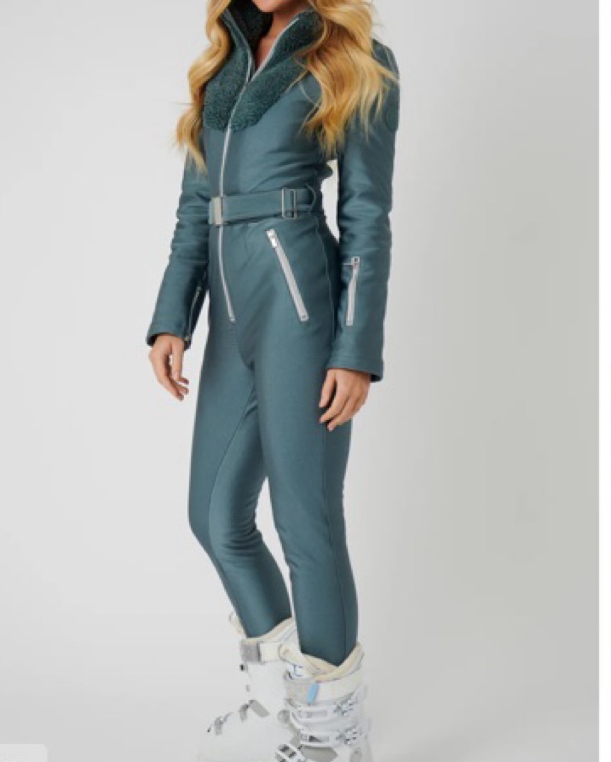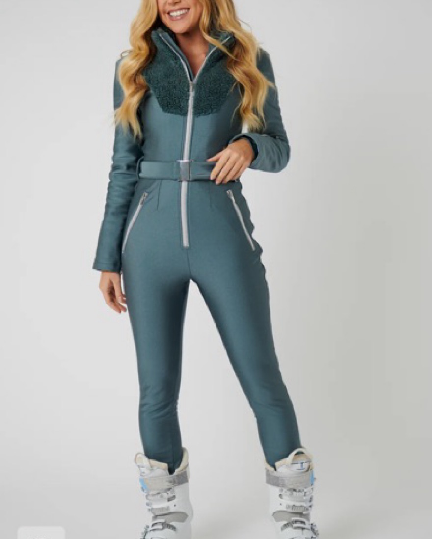 Guaranteed to turn heads - our 'IT' suit is form fitting and flattering with ultra-luxe teddy sherpa detailing. Inspired by exploration and adventure, our athletic sherpa ski suit in shimmering anthracite blue / grey is the perfect mix of performance meets fashion.