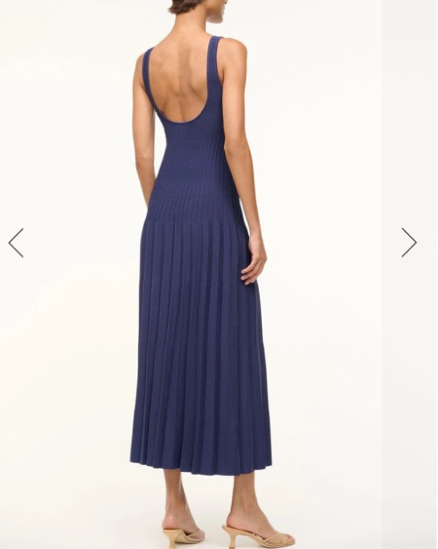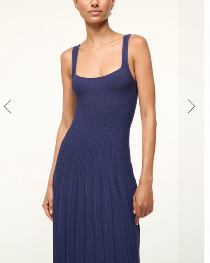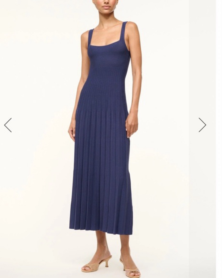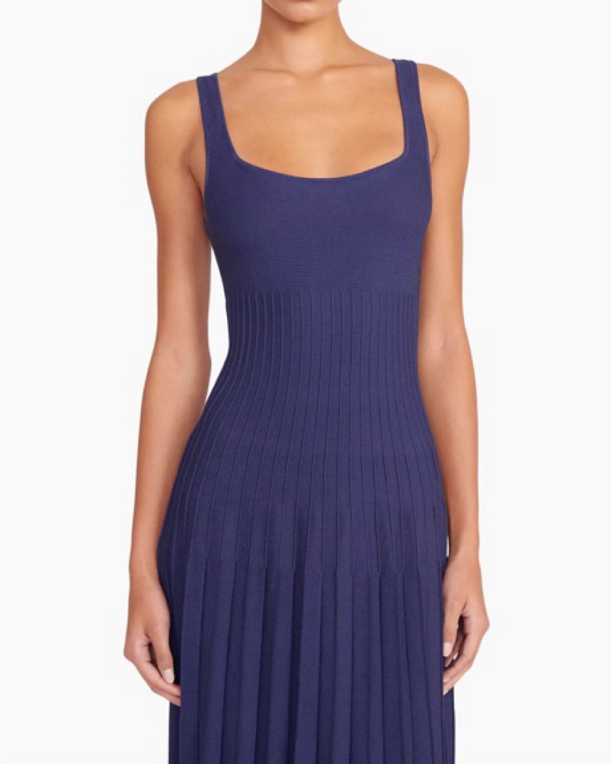 Navy Ellison midi dress from Staud featuring a square neckline and stitch detailing. The knit material is super flattering!