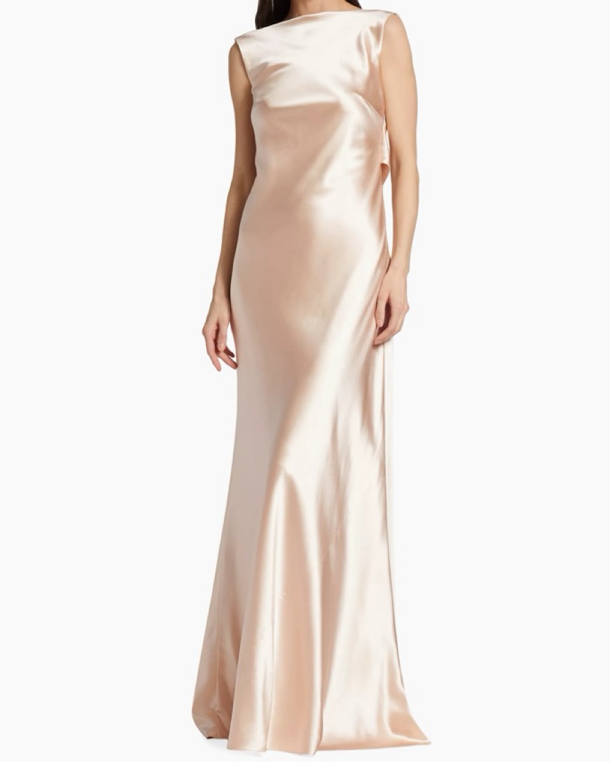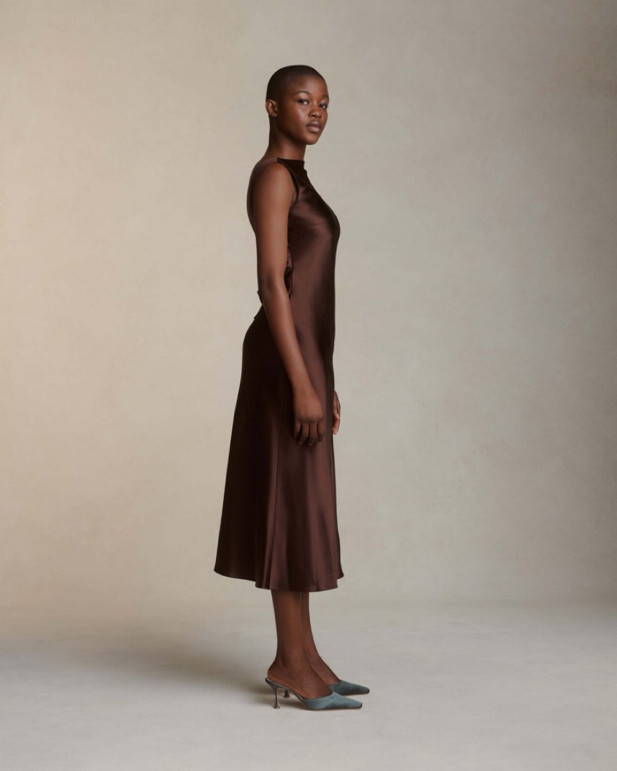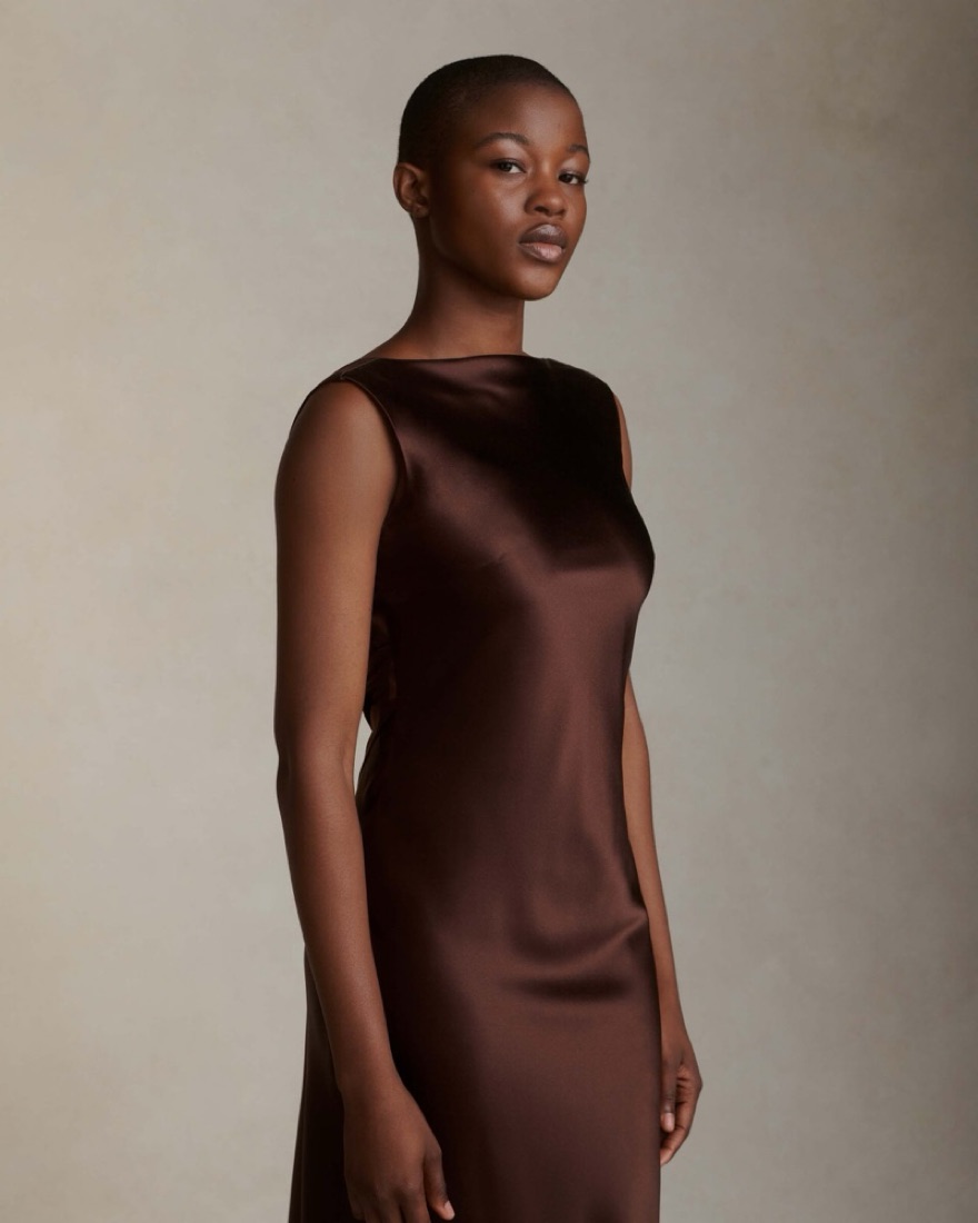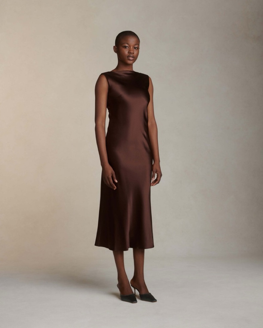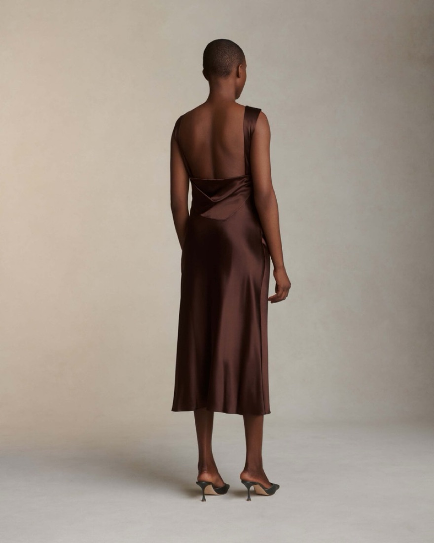 AMAZING wedding guest/formal event dress. I had the Charlie Espresso Dress made in floor length. Pictured is the Charlie midi for color reference, and the Charlie floor length for shape reference (this dress is in espresso, NOT the light pink!) I am 5’5 for reference. Must return dry cleaned! 💖
