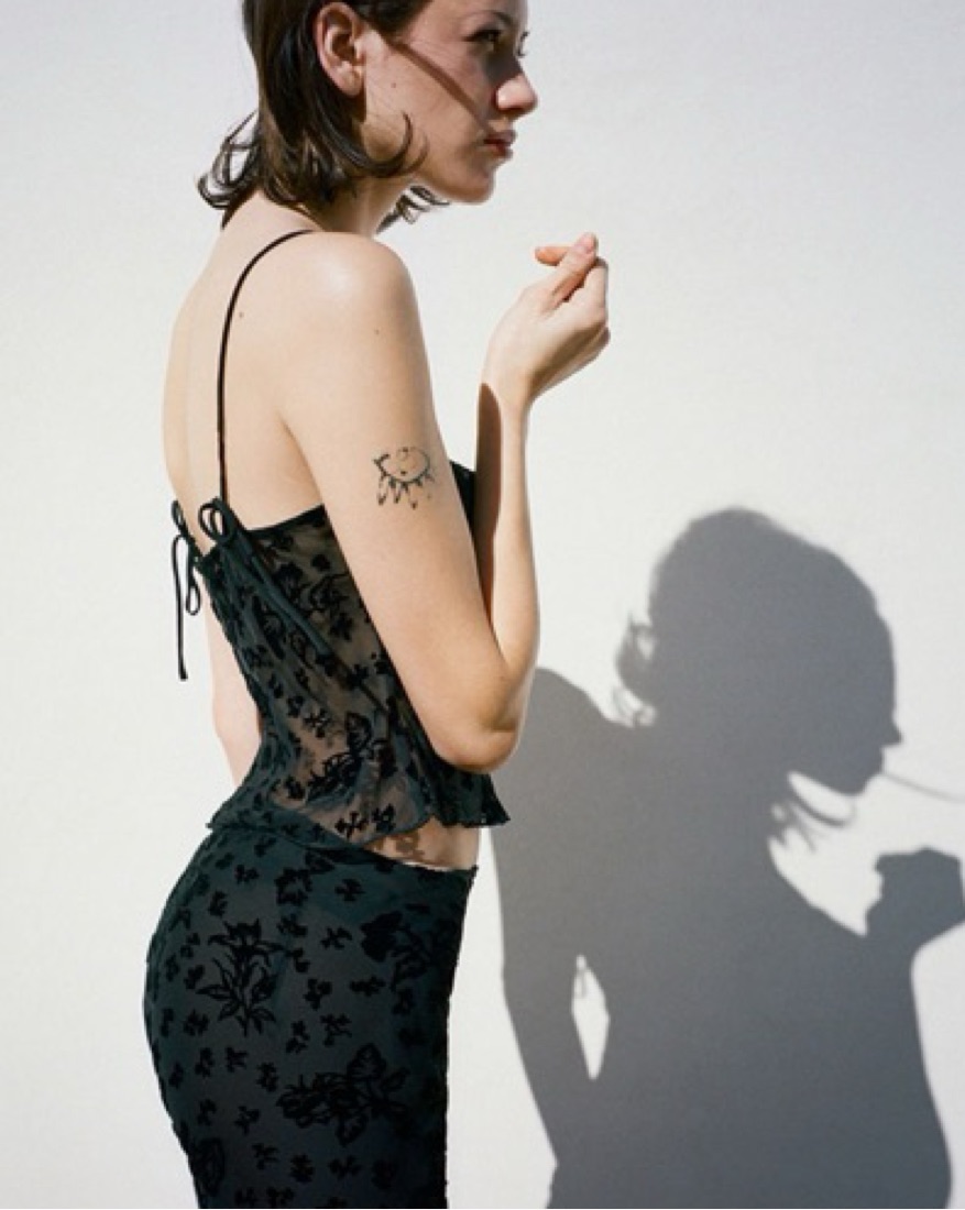Straight neck camisole top Relaxed fit Slip on style, no zip Bias cut Adjustable thin straps, which tie at back Sheer fabric