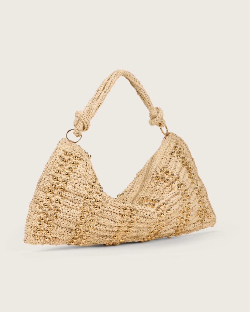 Like new, shoulder bag/clutch in raffia with gold dome stud hardware
