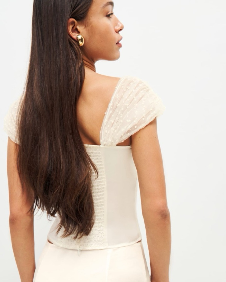 Beautiful cream silk charmeuse top with fitted bodice, back smocking with invisible zipper and pretty sheer dot chiffon cap sleeves. Fits TTS Size 4, Color Fior Di Latte (light cream)